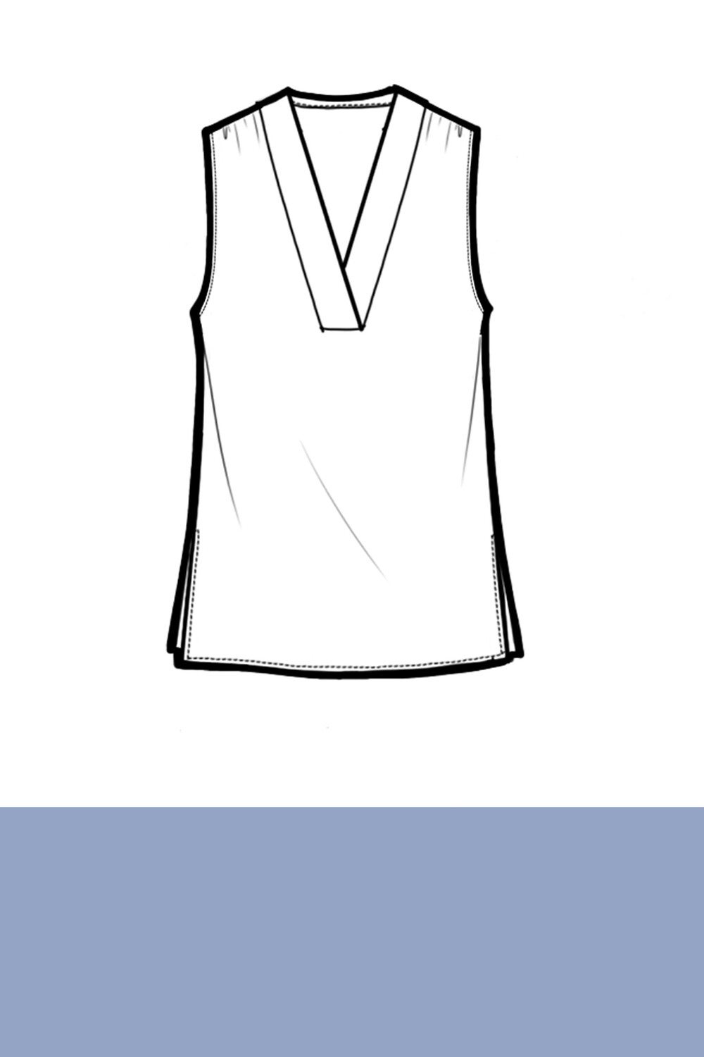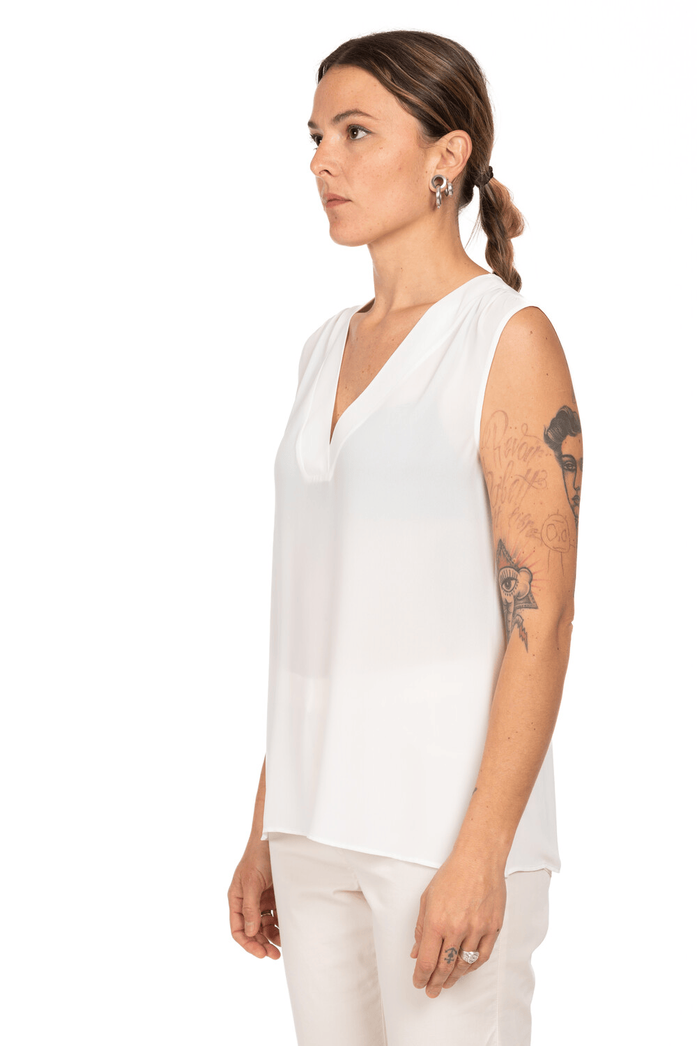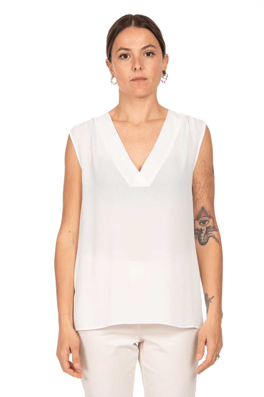 Blusa smanicata in tessuto fluido con scollo a V profondo bordato, dal taglio essenziale e leggermente svasato: un capo passe-partout dalla raffinatezza discreta. Leggera e versatile, è perfetta da indossare sotto blazer o cardigan.