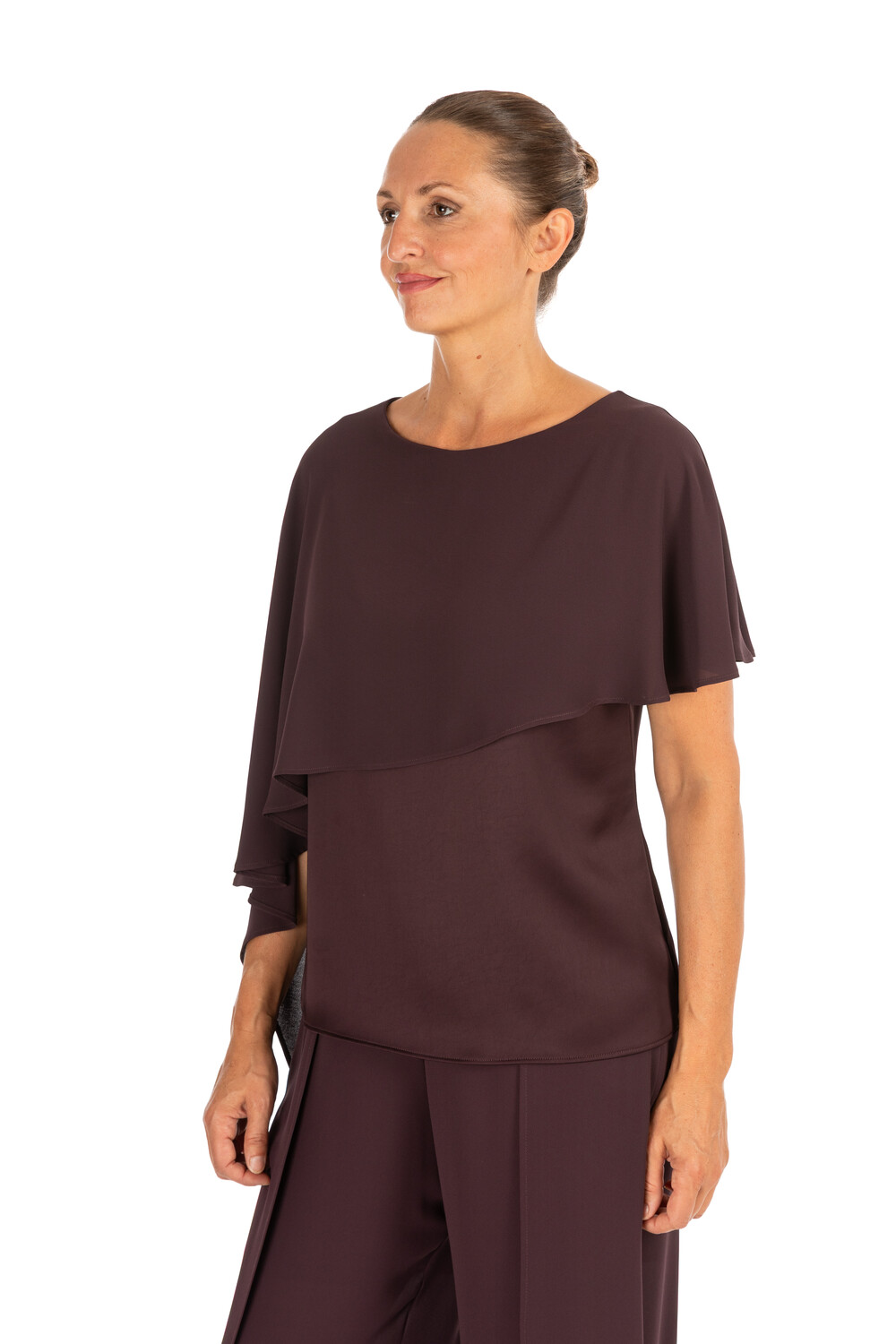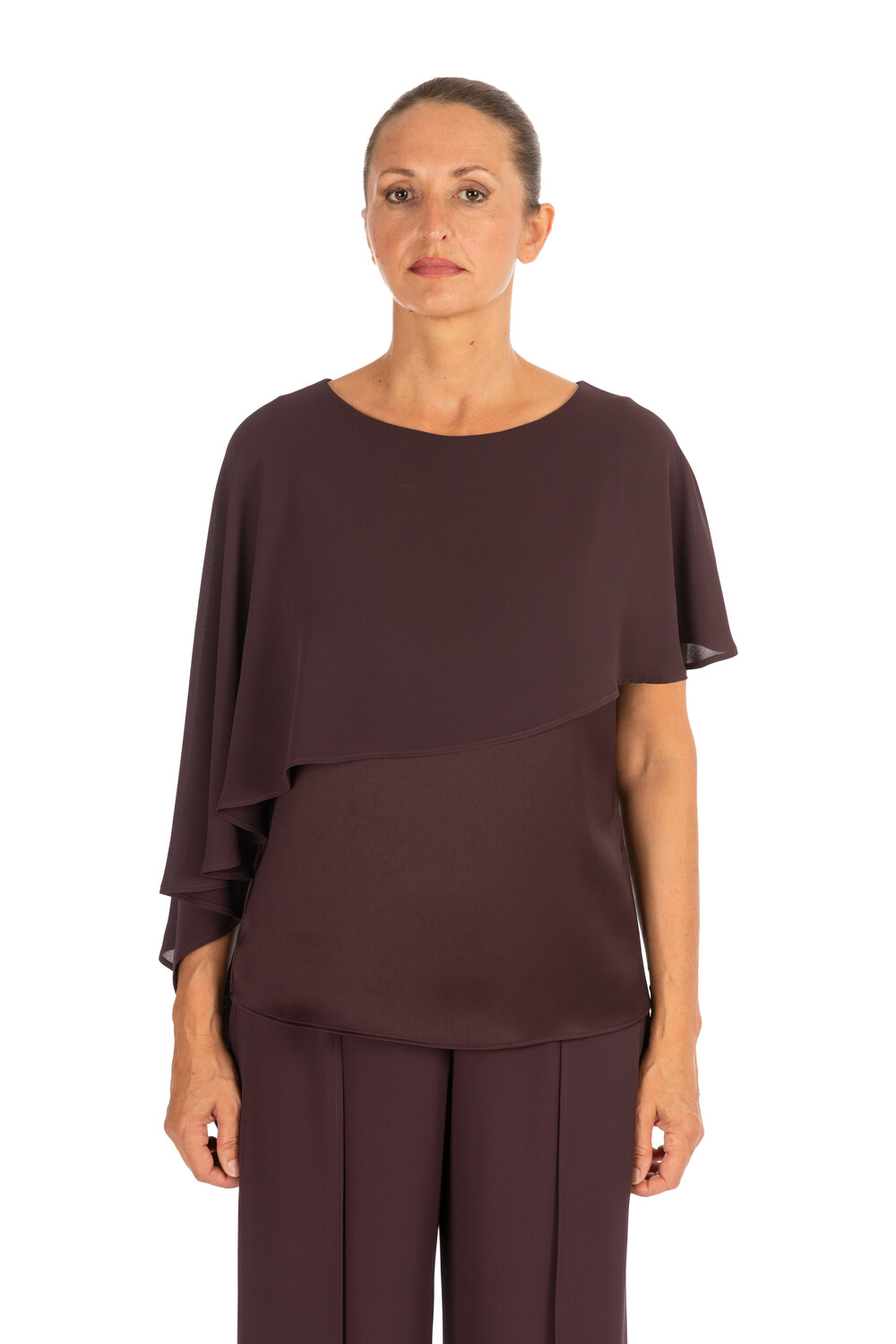 Blusa in georgette fluida con drappeggio asimmetrico e maniche ad aletta. Il taglio morbido e il colore intenso donano un'eleganza sobria e femminile.