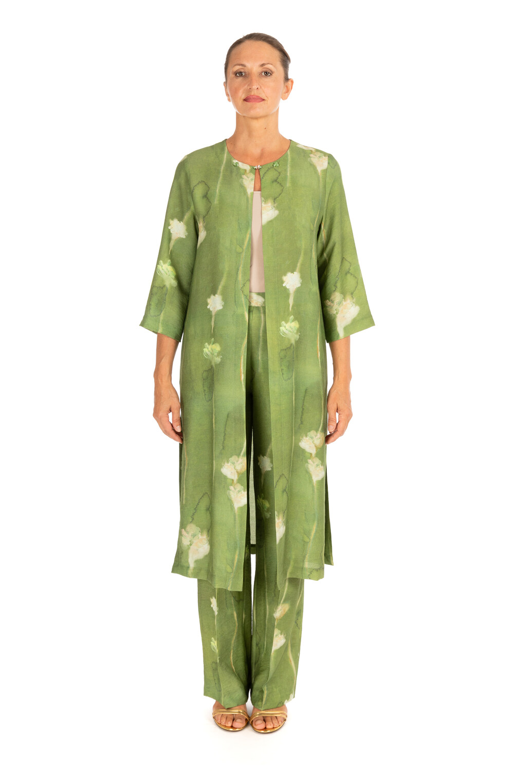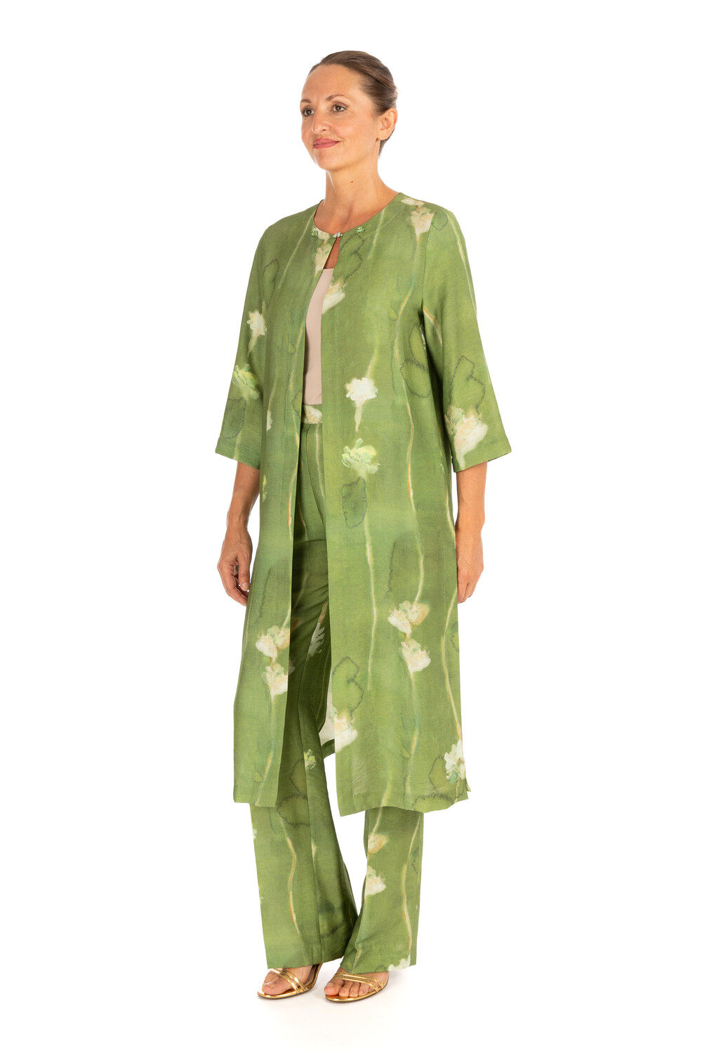 Spolverino lungo con stampato. Il taglio dritto, le maniche a tre quarti e l'apertura frontale con piccolo bottone gioiello donano eleganza ariosa e naturale.