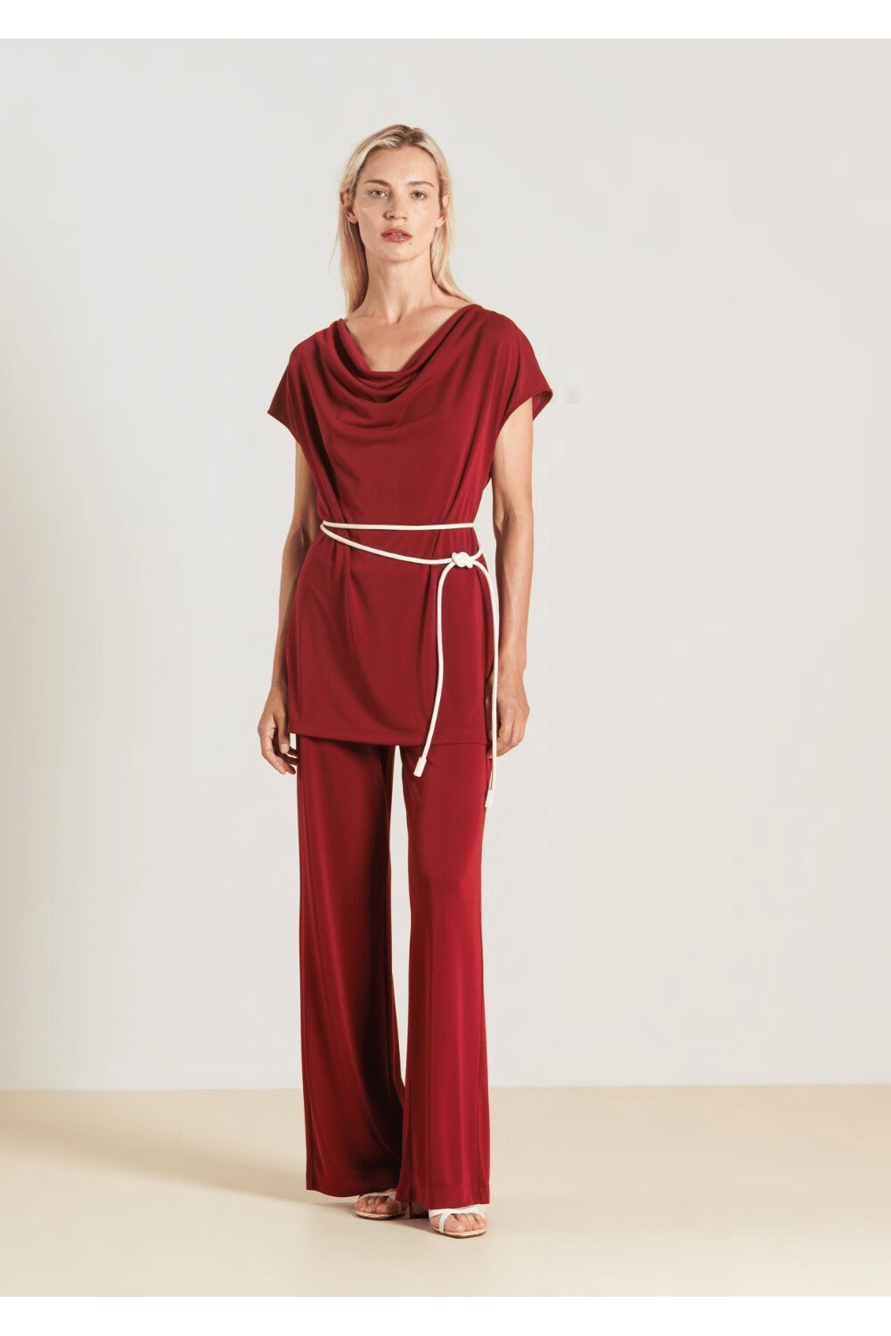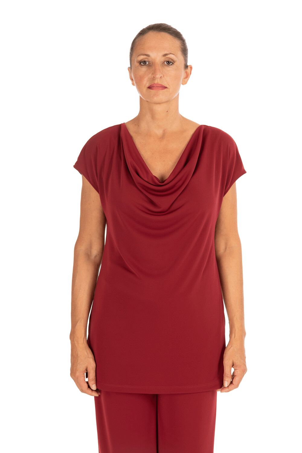Top con scollo morbido a cascata, perfetto per valorizzare con delicatezza il décolleté. Le maniche corte e il taglio leggermente svasato donano comfort e una vestibilità fluida e femminile.