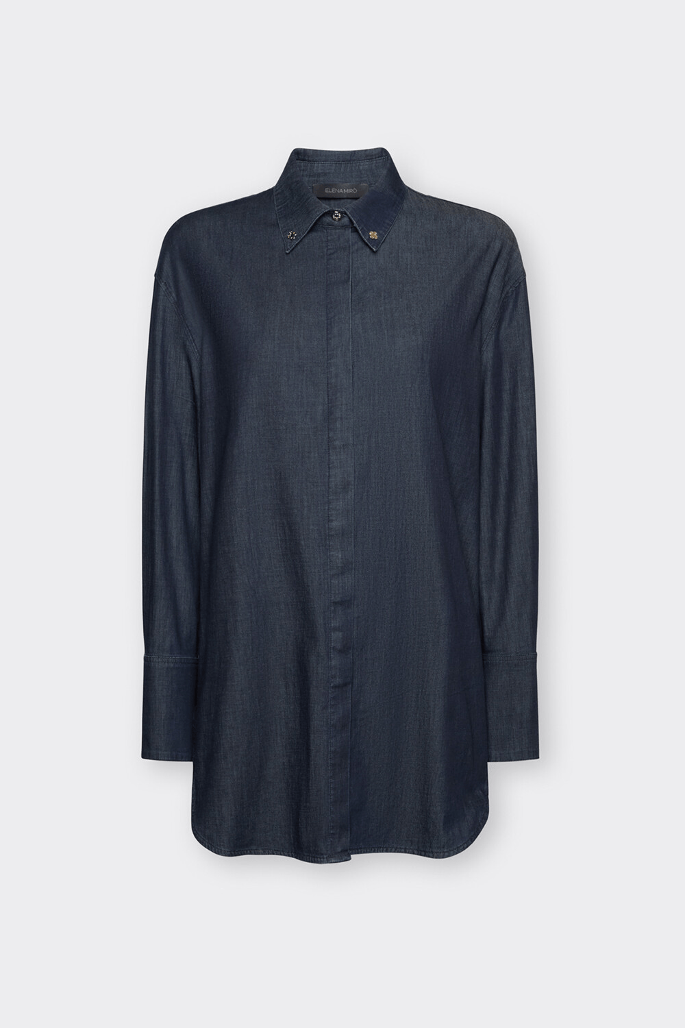 Perfetto per chi desidera un look casual, è la camicia in chambrè. Particolare attenzione ai dettagli: il fit regular, il fondo stondato e l'abbottonatura all'inglese la rendono ricercata. Speciale e prezioso il dettaglio dei due rivetti monogramma sul colletto a punta. Un connubio tra praticità ed eleganza. Annodata sopra al vestito in chambray, si abbina perfettamente.