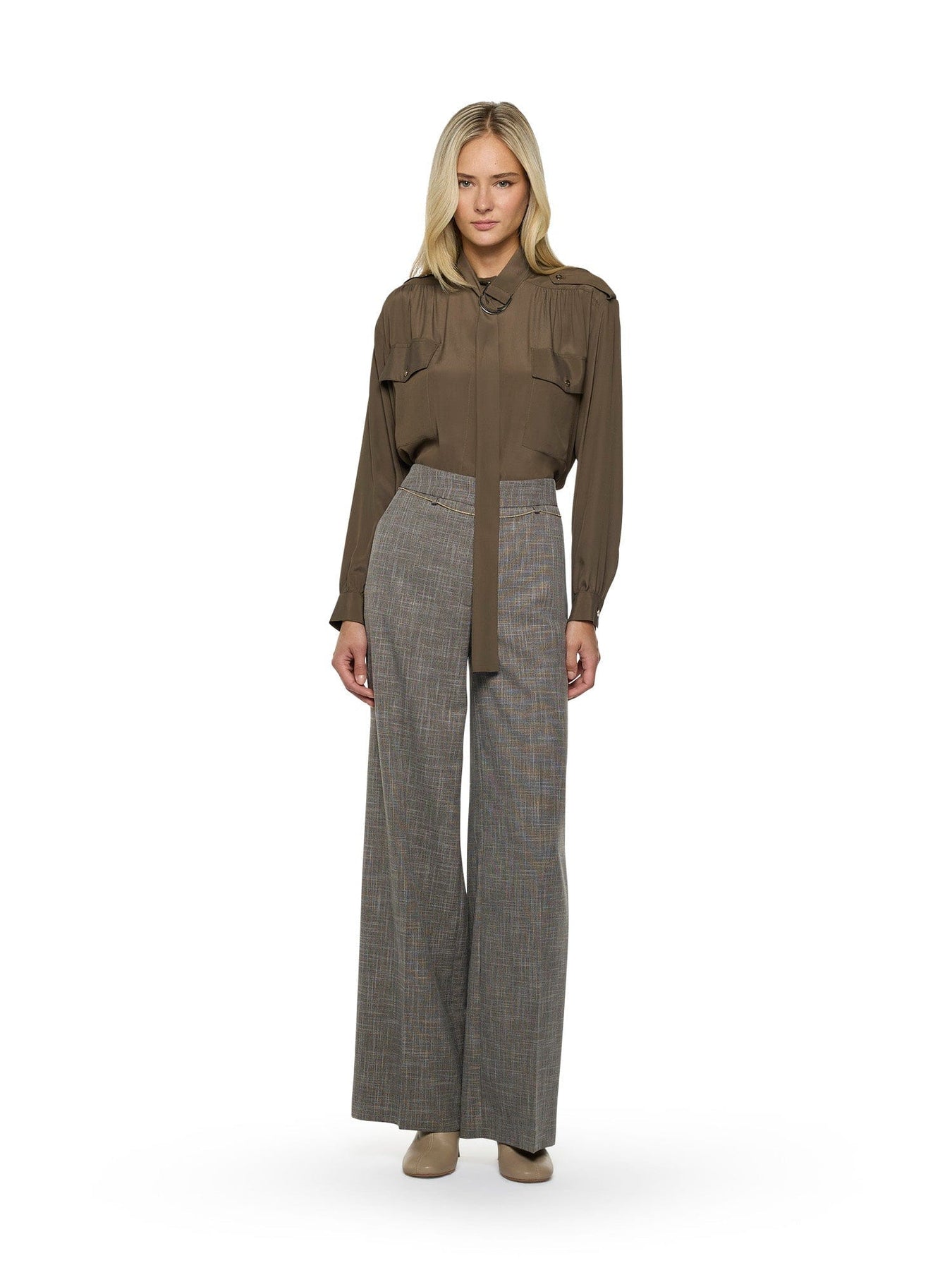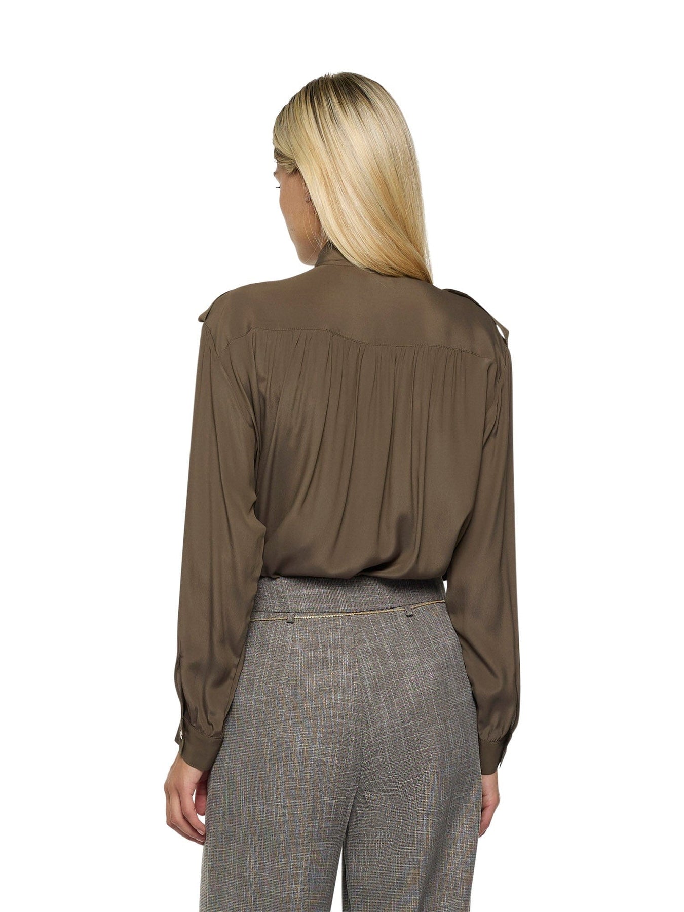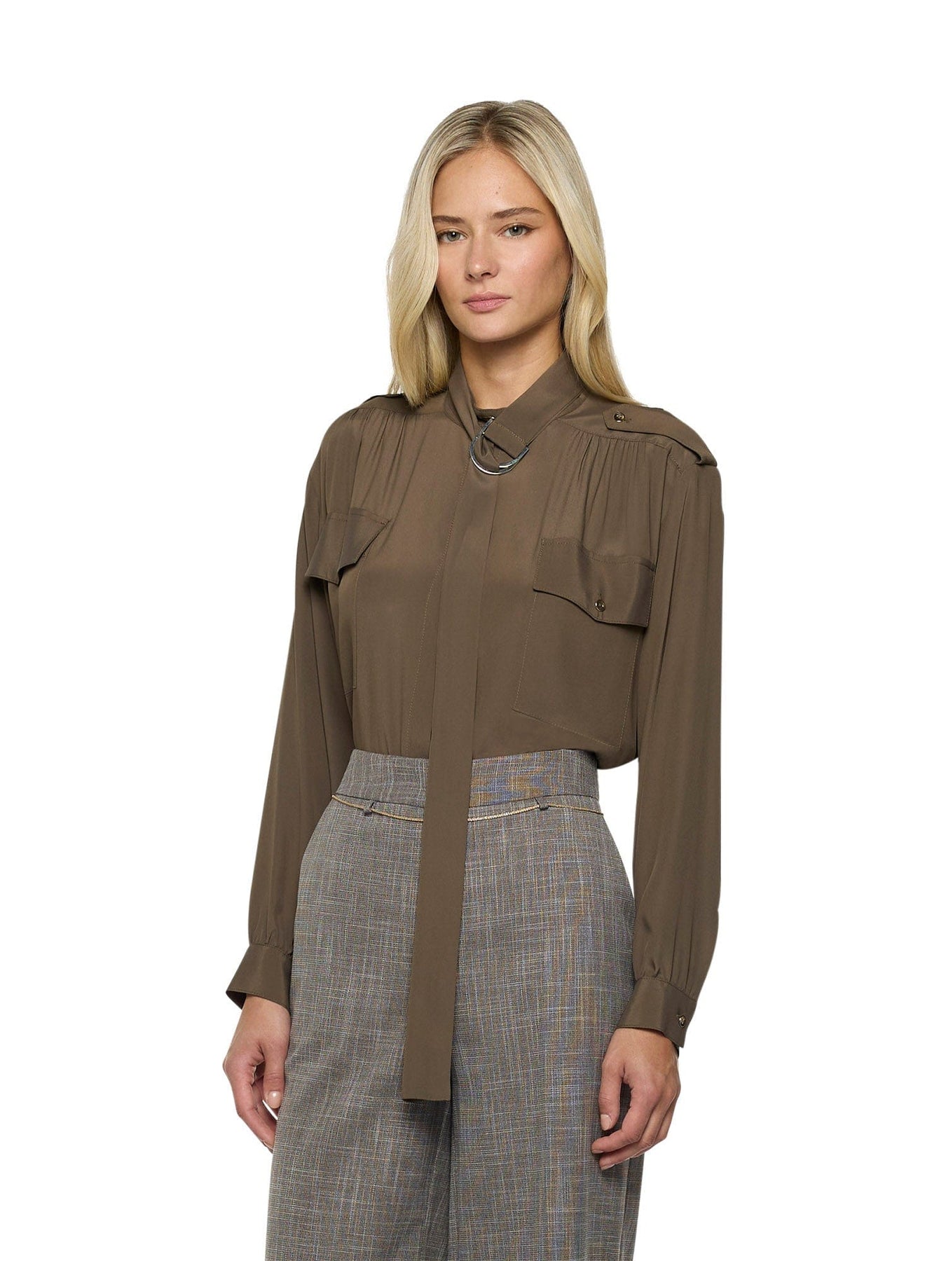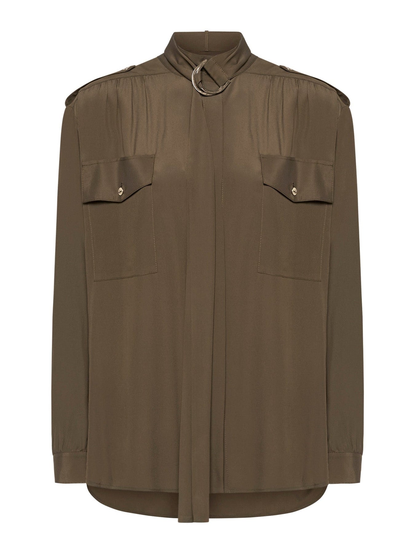 Blusa in stile militare in acetato di seta con laccetto lavallière, dettagli arricciati su carré e polsini. Lavallière extra-lunga con anelli a D dorati e tasche sul petto con bottoni.