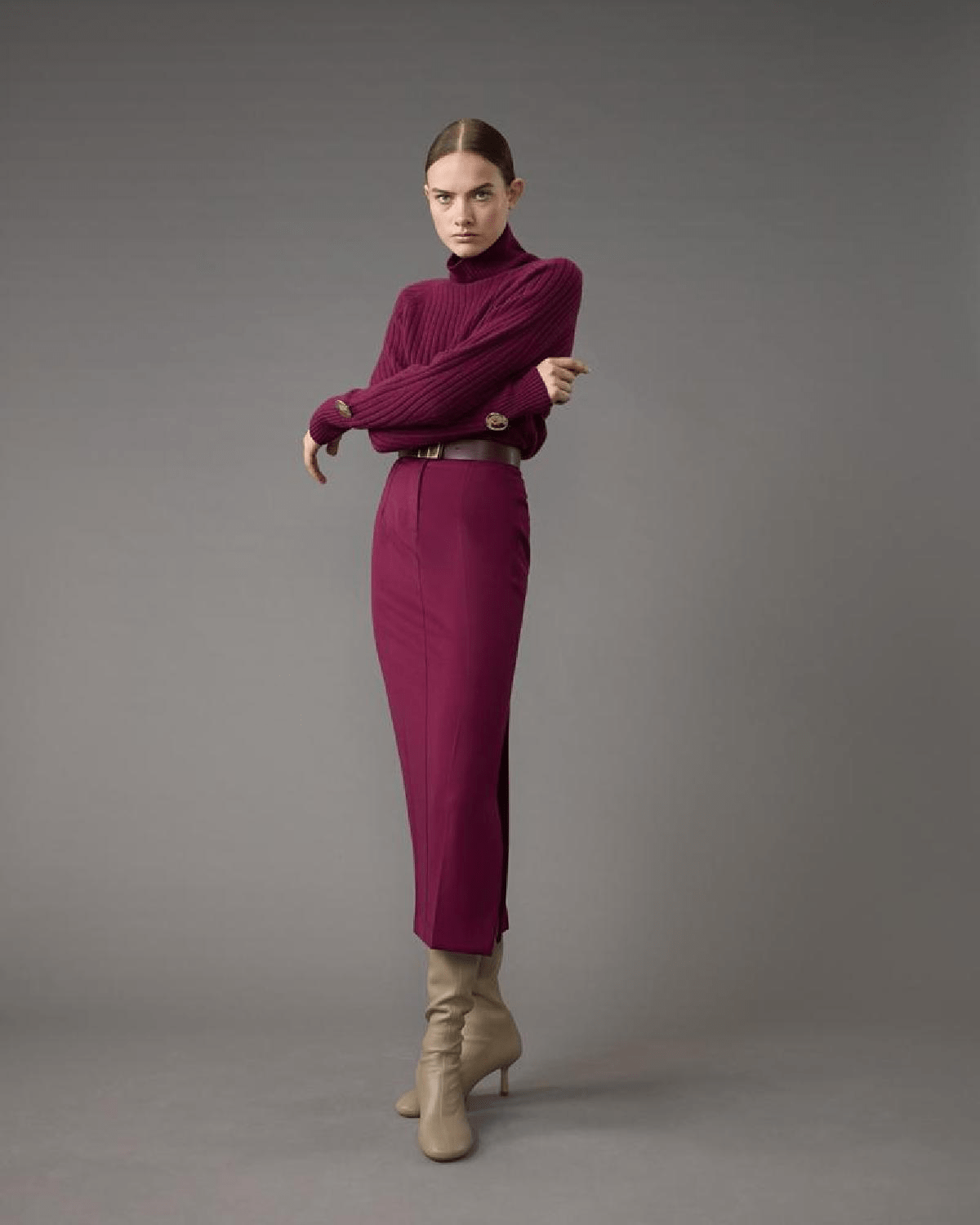 Gonna a matita in tela di transizione con profondo spacco laterale a sinistra. Chiusura frontale con cerniera e gancio metallico.
