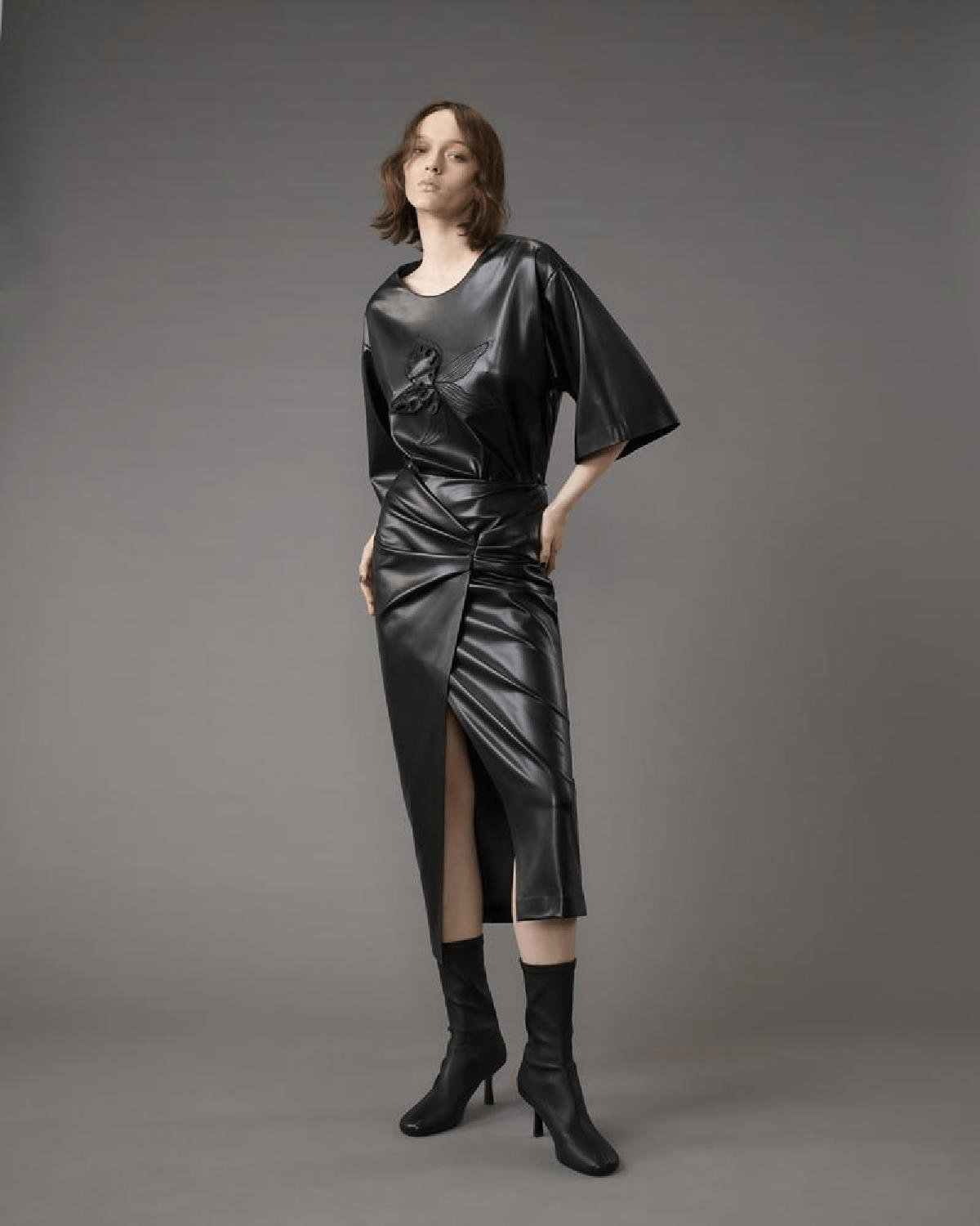 Gonna a tubino in pelle vegana con profondo spacco frontale diagonale. Chiusura laterale con zip.