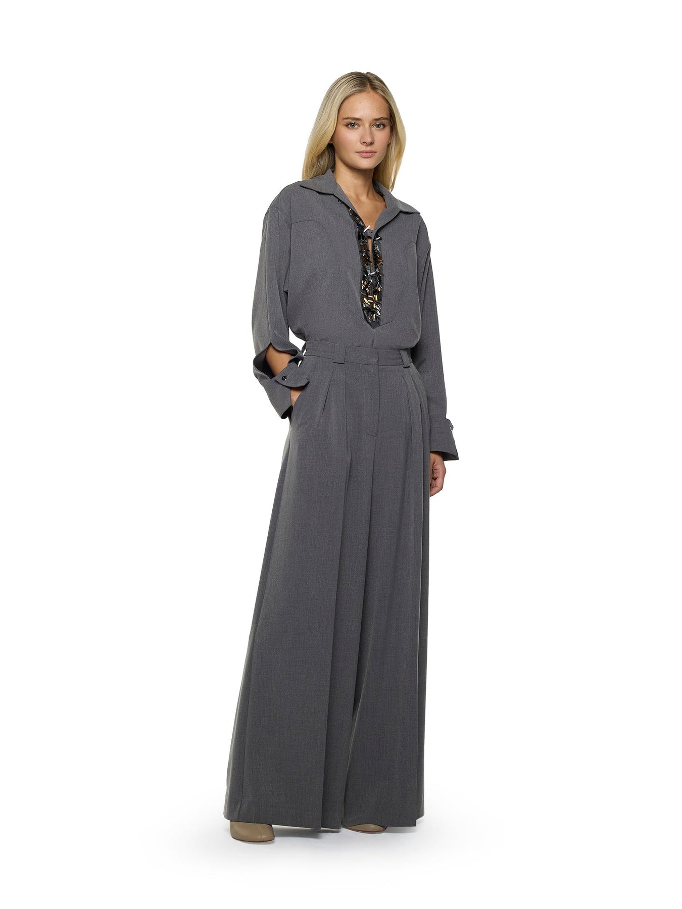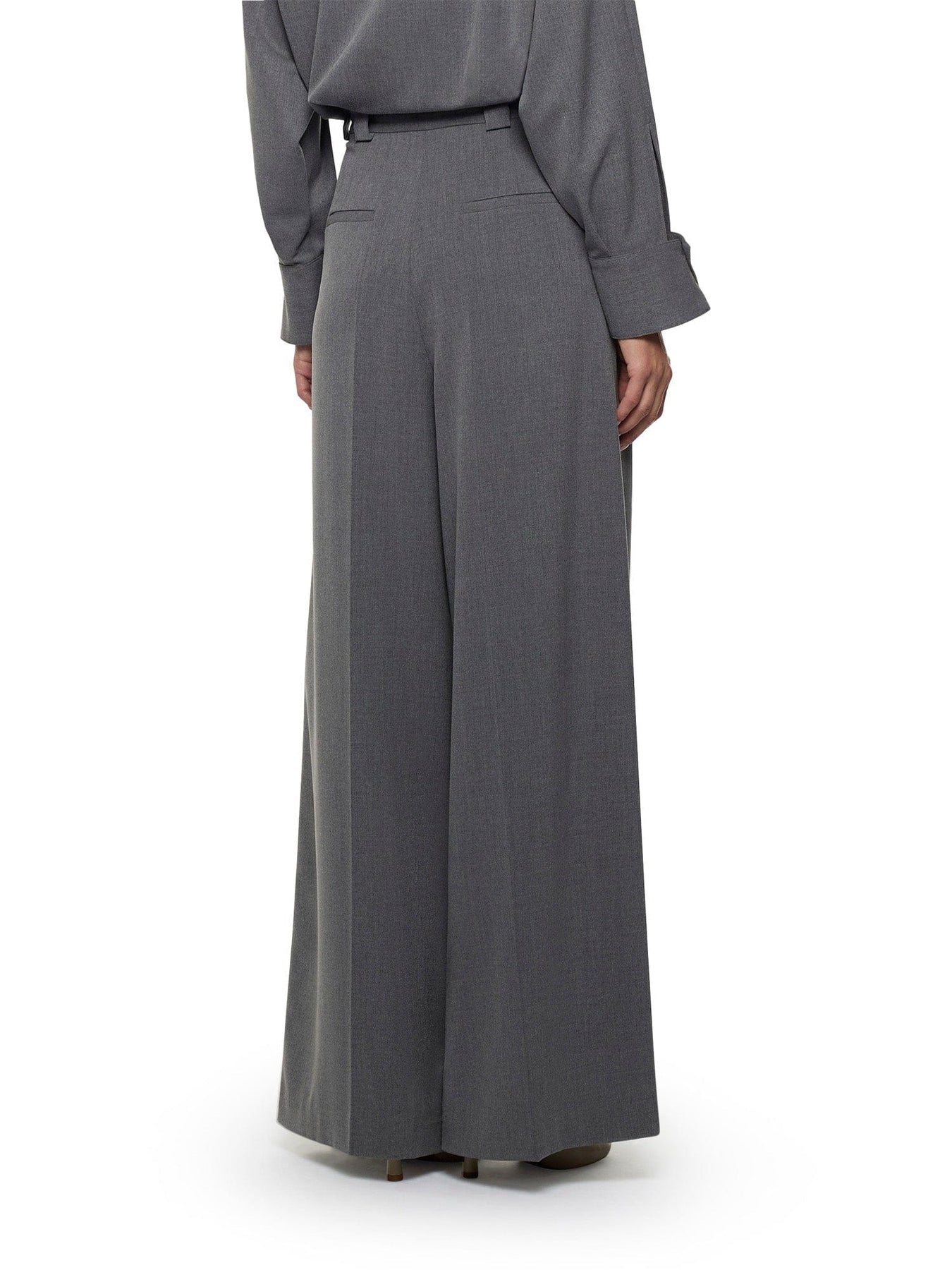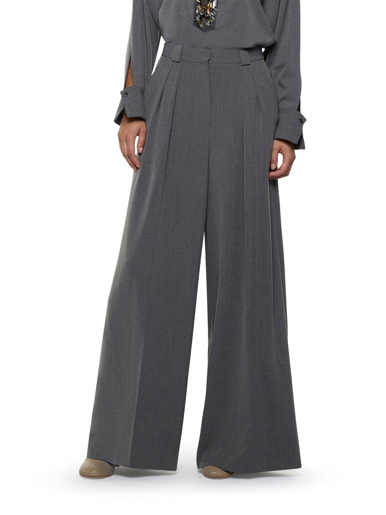 Pantaloni a gamba larga con pieghe in tela di transizione. Dettaglio a doppia piega. Tasche laterali e finte tasche a filetto sul retro. Chiusura frontale con cerniera e bottone.
