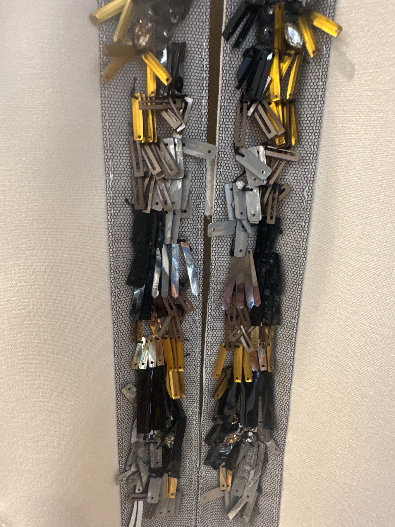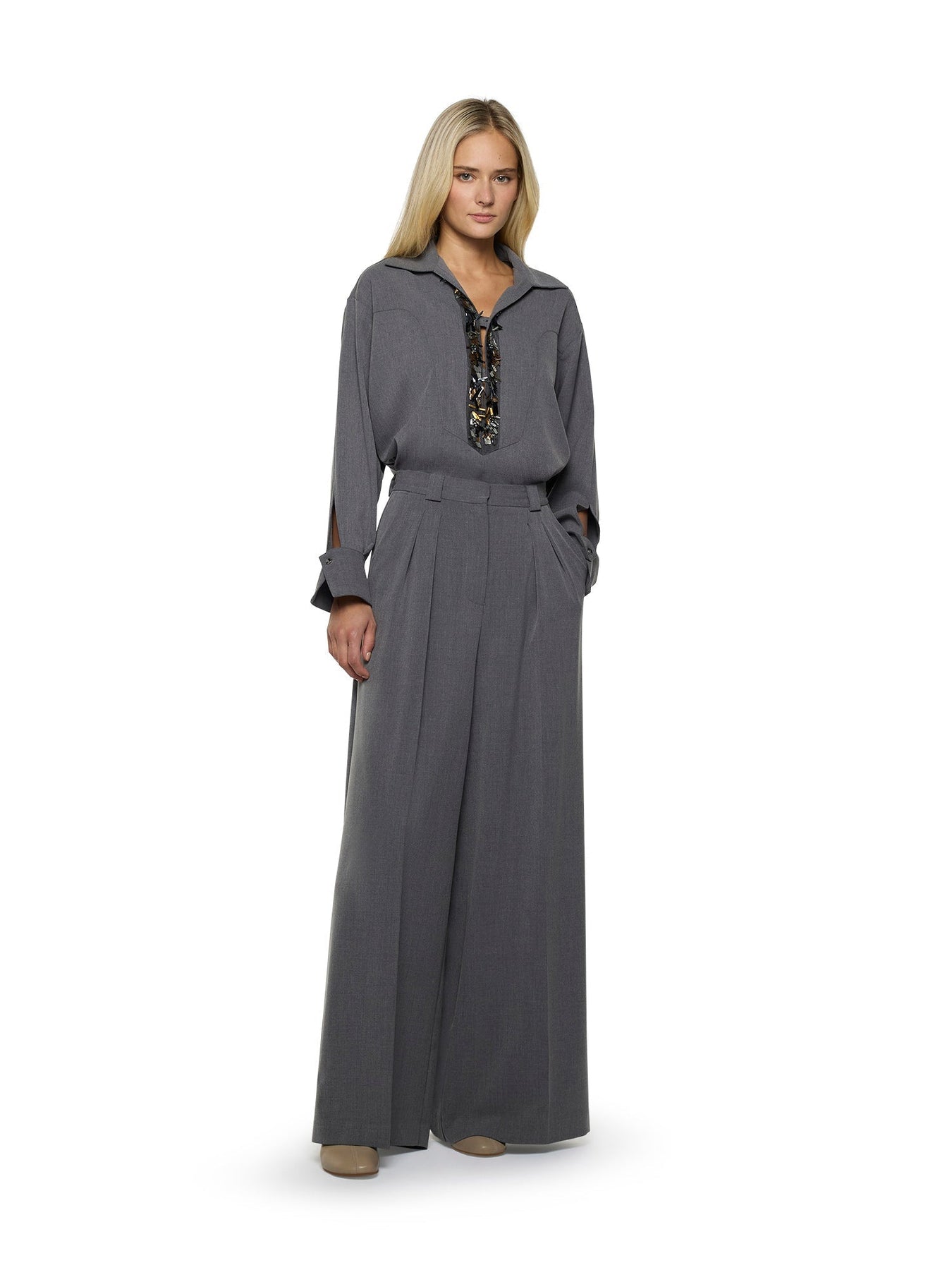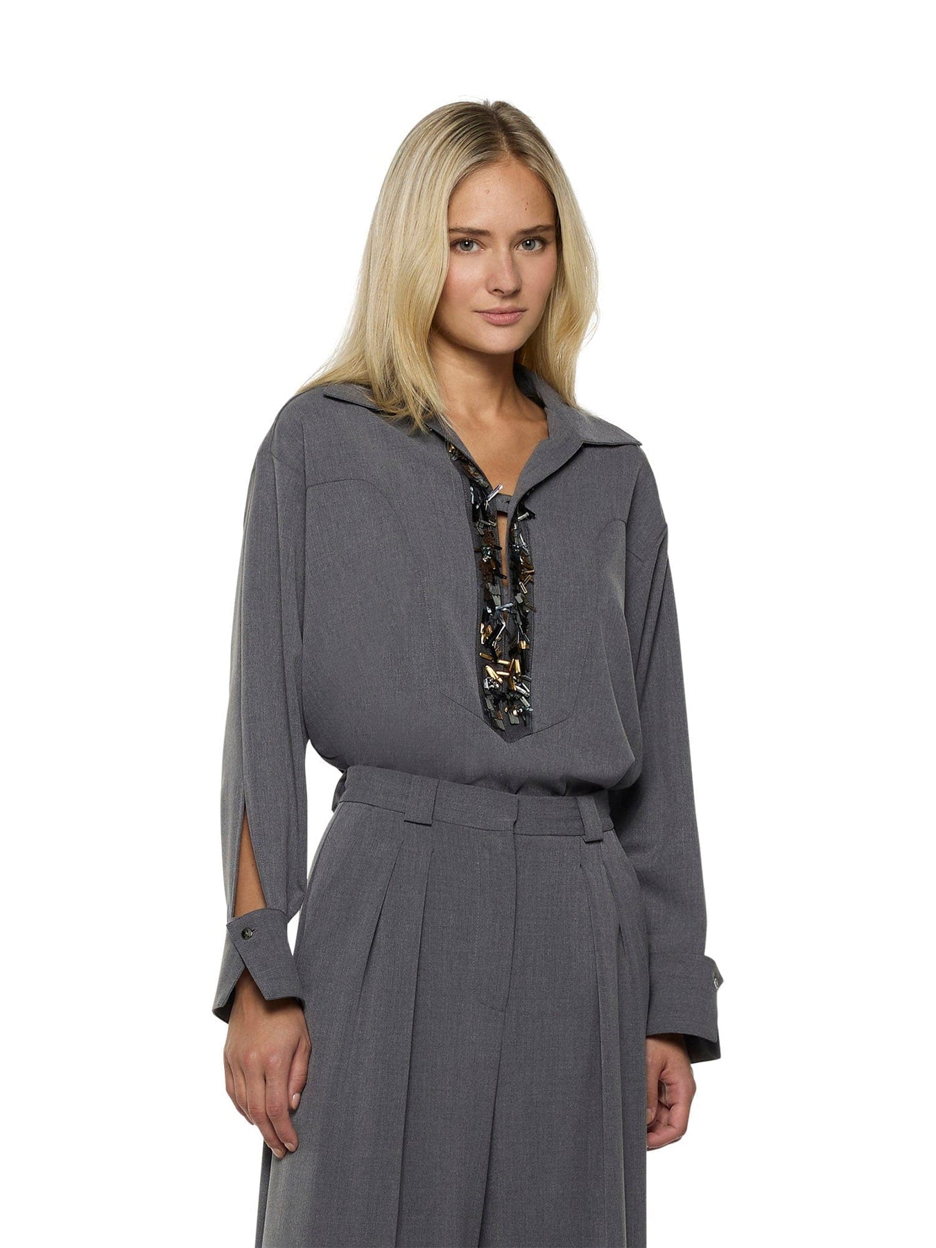 Tunica a maniche lunghe in tela di transizione con profonda scollatura a V ricamata. Spacco frontale e polsini con bottoni.