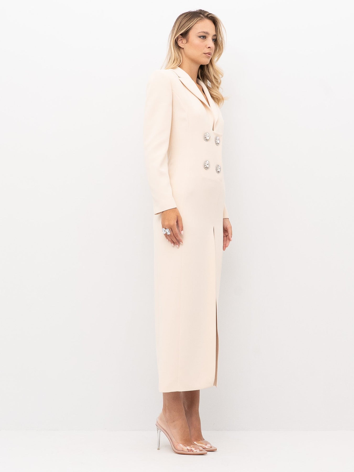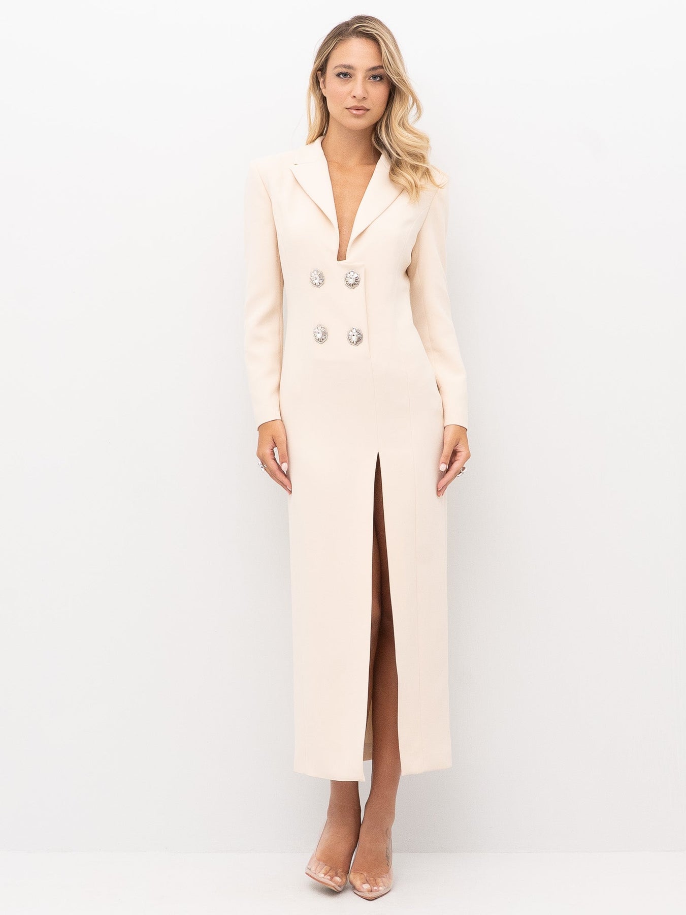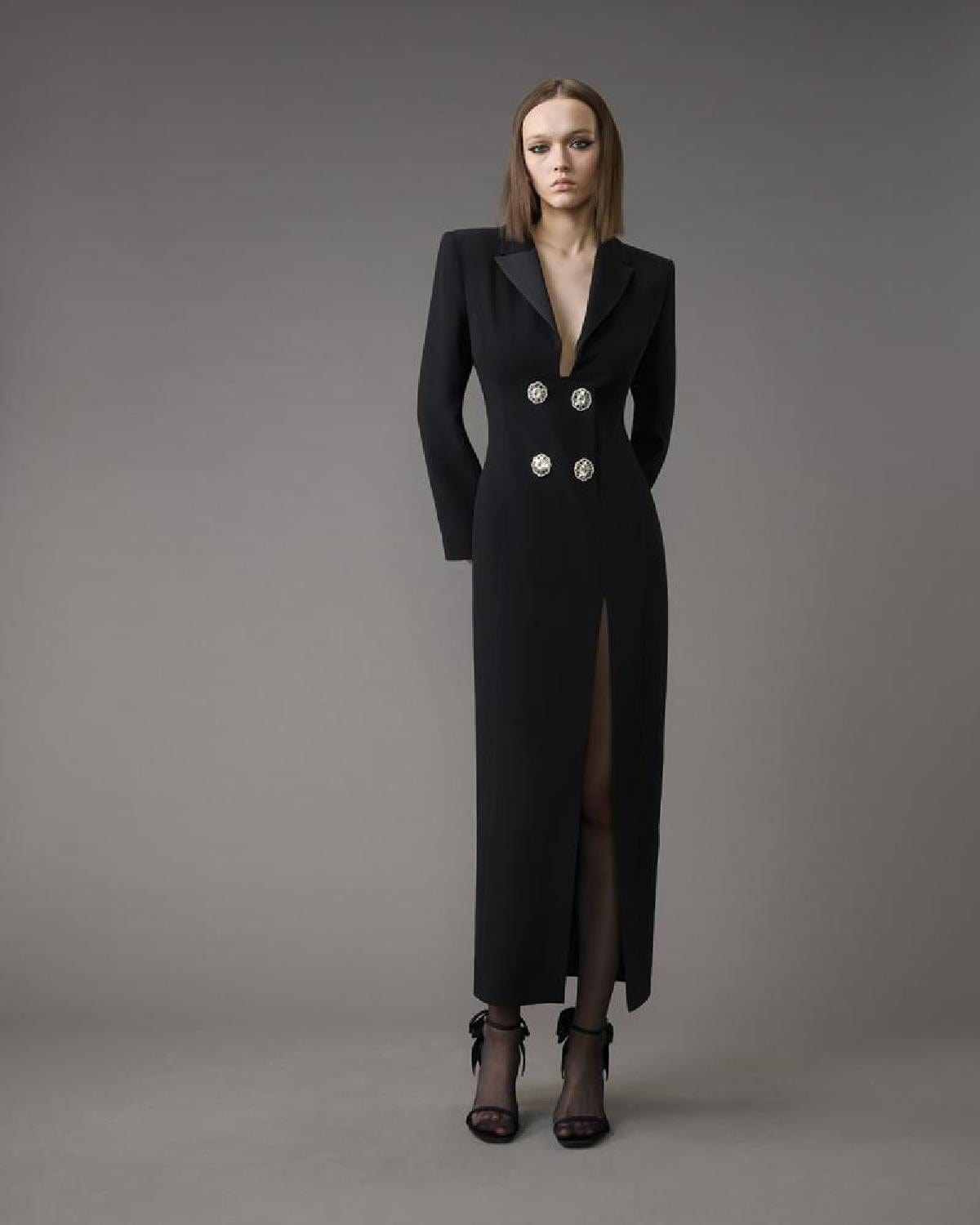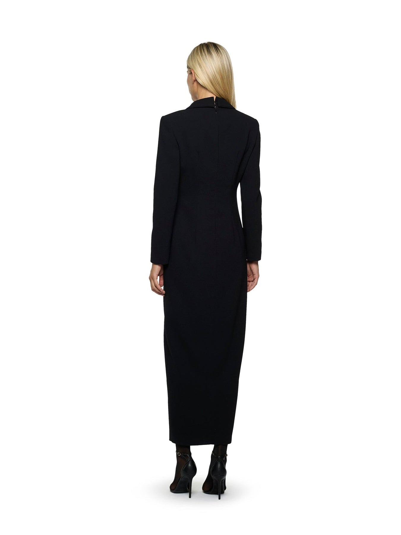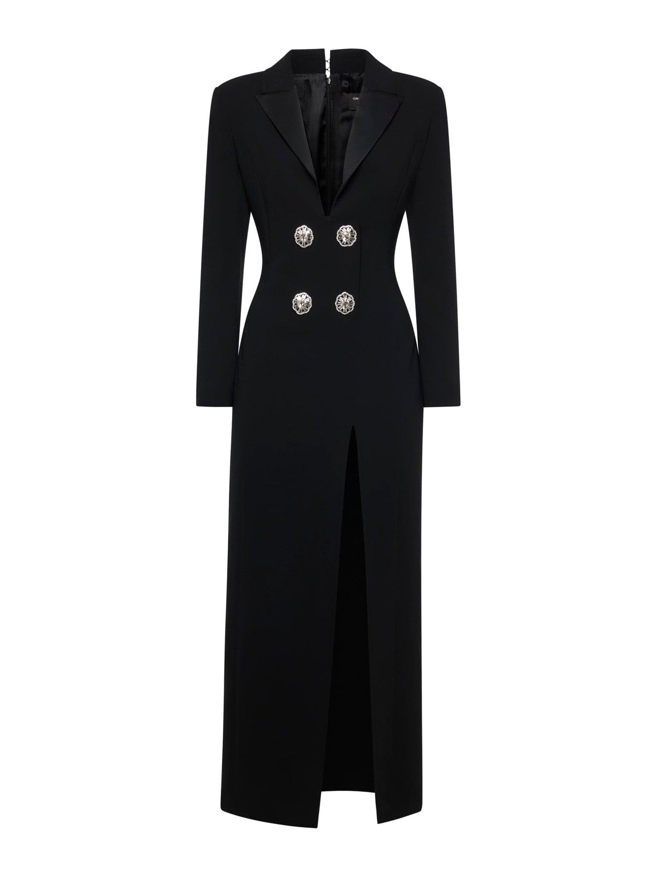 Abito da sera in raso a maniche lunghe con bottoni gioiello in cristallo. Ampi revers a punta e profonda scollatura a V. Chiusura posteriore con cerniera nascosta. Vita aderente, spacco laterale e orlo dritto.
