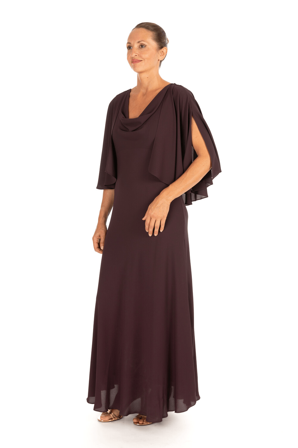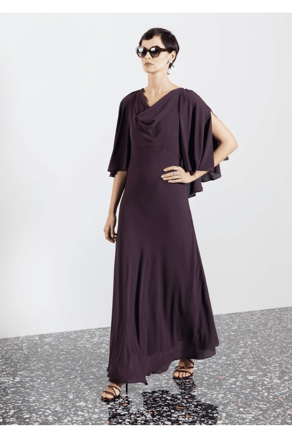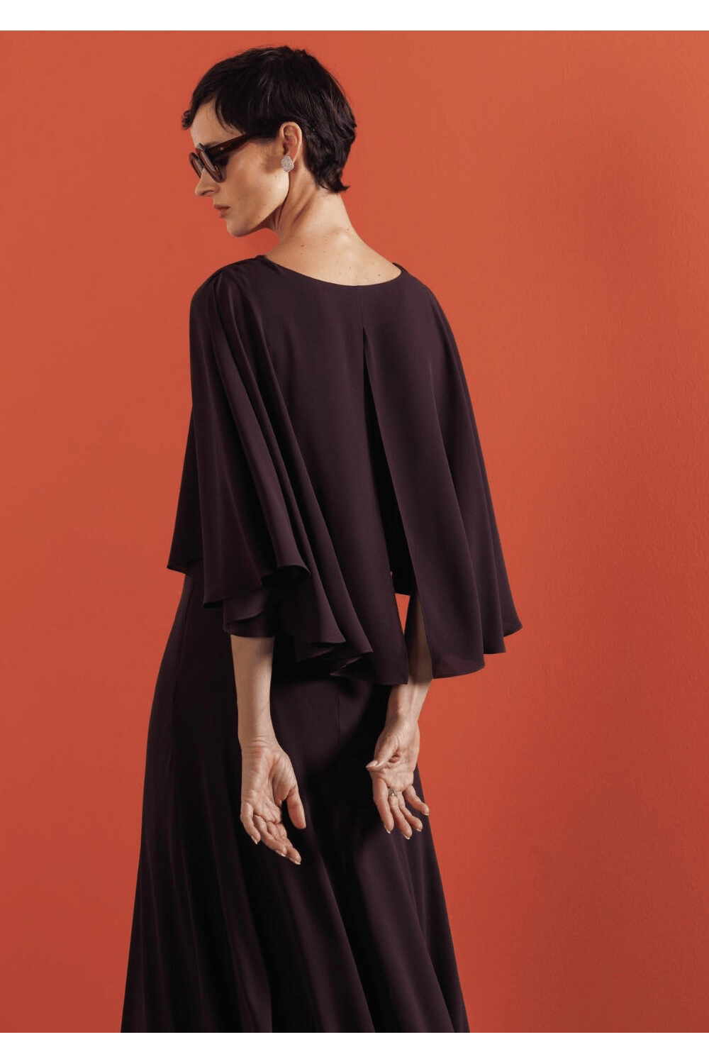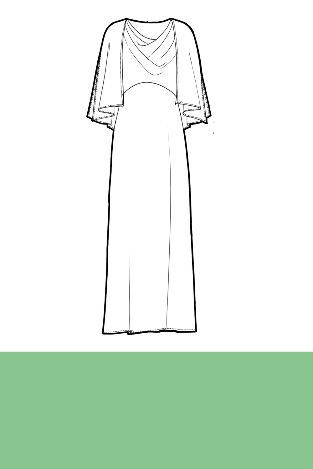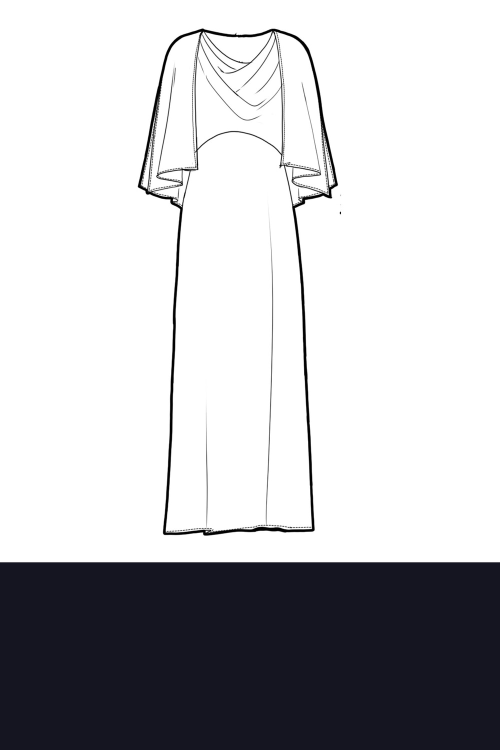 Elegante abito lungo con scollo morbido e mantella integrata sulle spalle, che crea un raffinato effetto a strati. La linea fluida esalta la femminilità con discrezione e fascino.