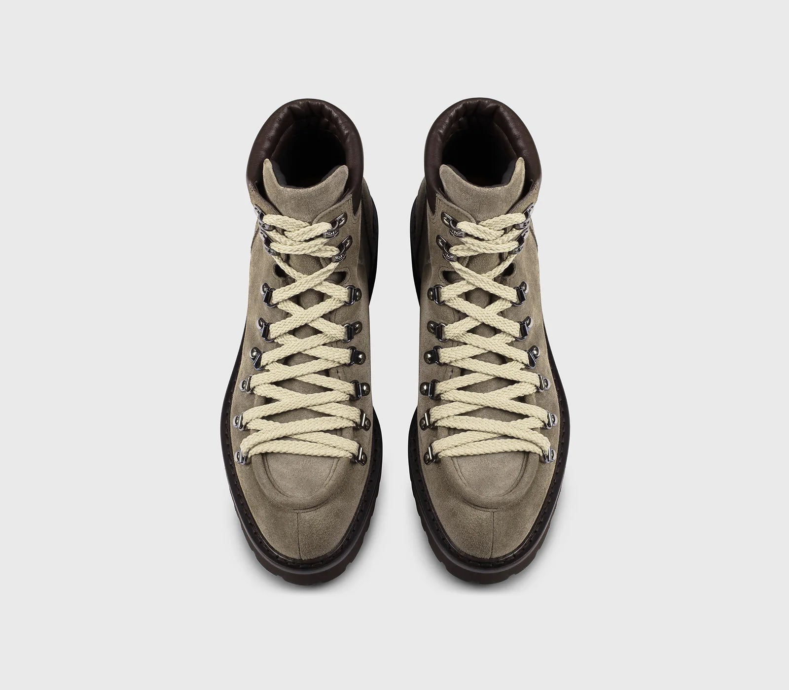 Scarponcino in suede color espresso con colletto imbottito in pelle e passanti in metallo. Made in Italy. DU3236GOTNPF813NM08.