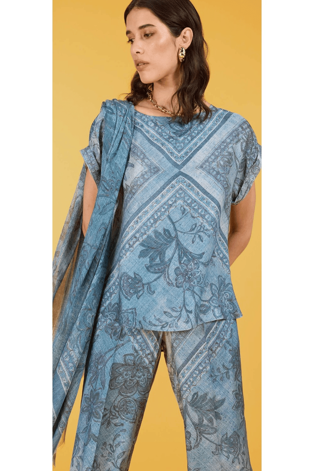Pantaloni cropped morbidi in twill di viscosa fluido, con vita regolare ed elastico interno personalizzato. Chiusura laterale con zip per un comfort elegante e pratico. Volume, eleganza e freschezza, esaltati dalla stampa, lasciano questo modello. Perfetto da abbinare alla blusa coordinata per una stampa totale di grande impatto.