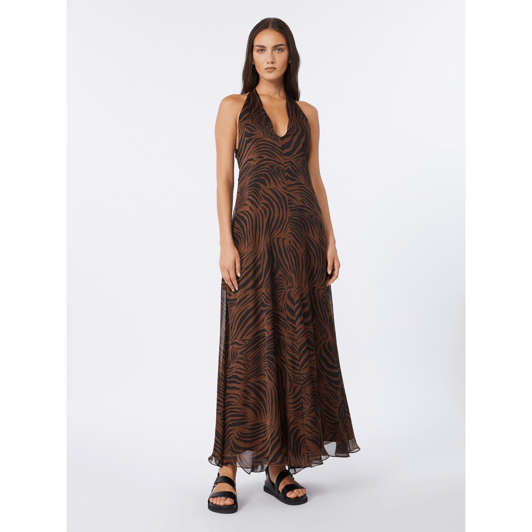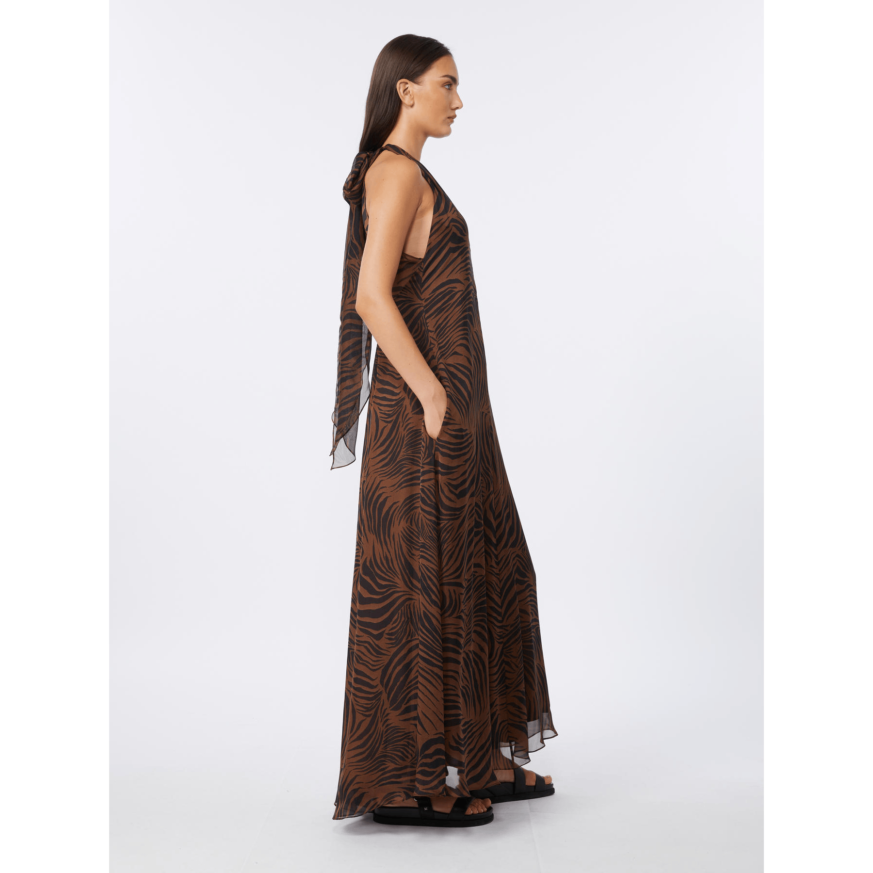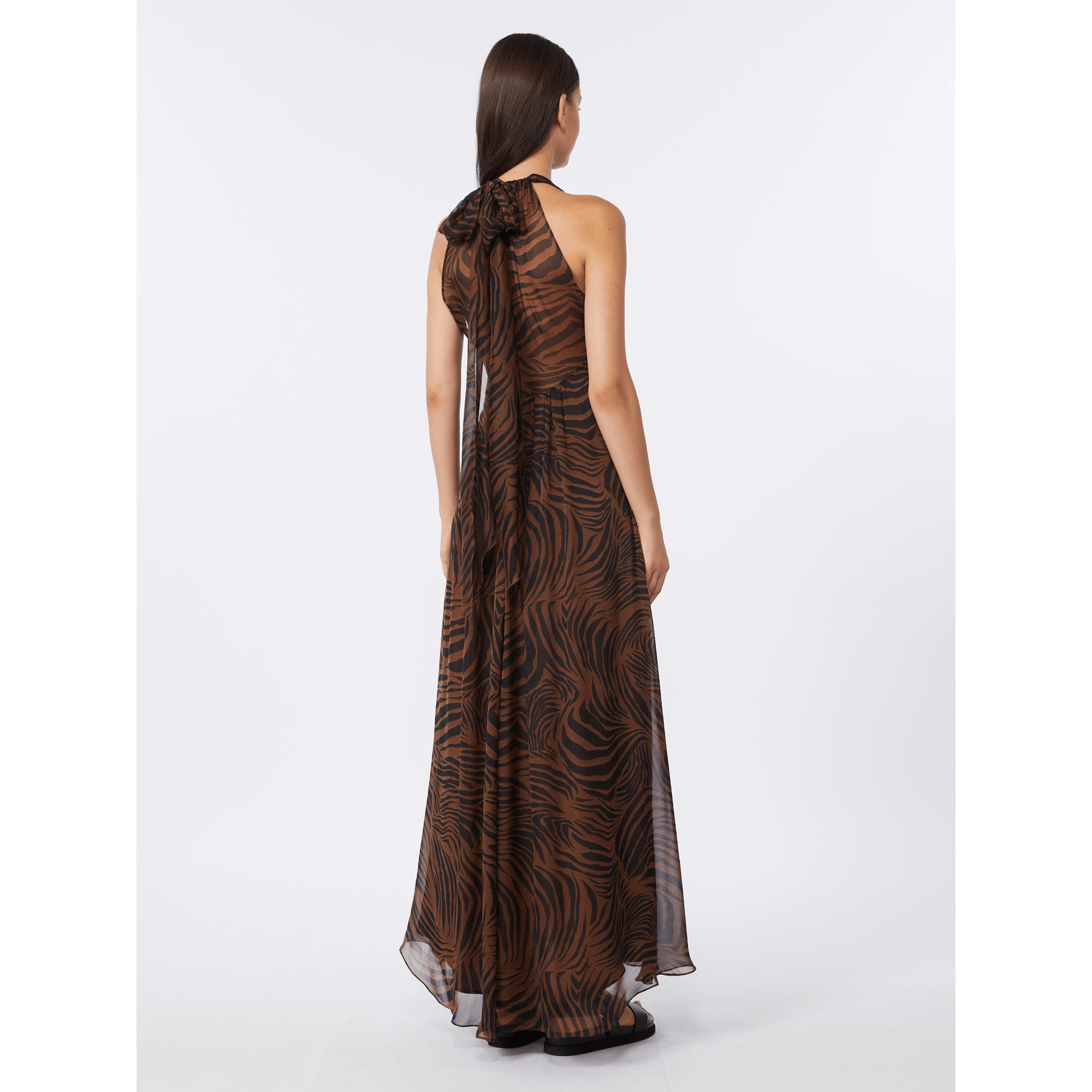 Abito lungo smanicato con motivo di collezione stampato all over.