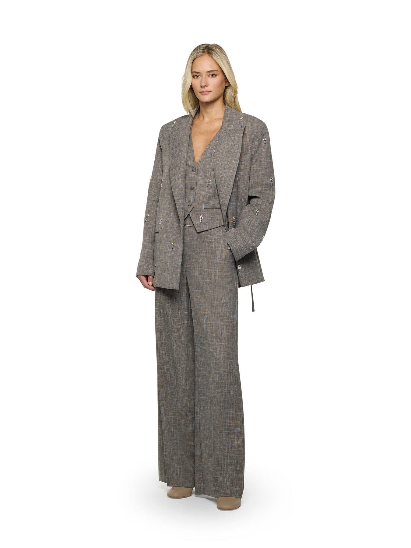 Pantalone in tela tramata dalla linea dritta con passanti per cintura catena oro. Chiusura frontale con cerniera, bottone e gancio metallico.