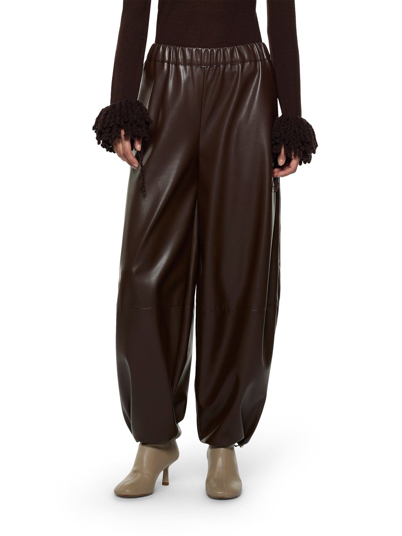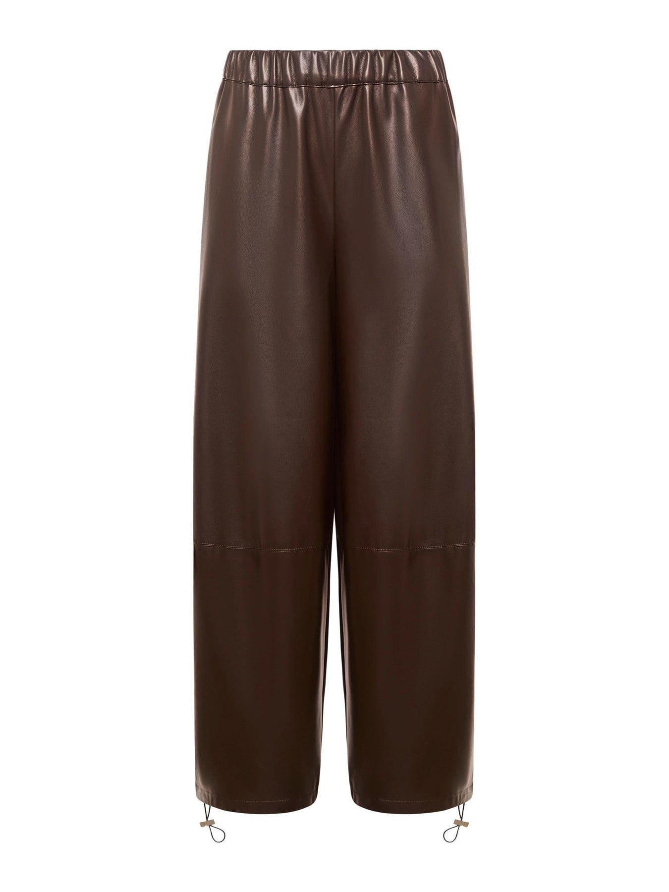 Pantaloni stile jogger in tessuto vegano effetto pelle, con elastico in vita e tasche laterali. La silhouette ampia e arrotondata è rifinita con coulisse sull'orlo.