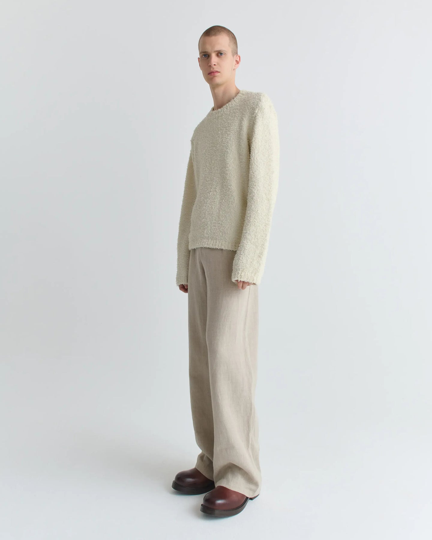 Maglione realizzato in un soffice filato bouclé di cotone/tencel. Presenta scollo rotondo, maniche lunghe e orlo regolare. Regular fit. 80% Cotone 20% Tencel. MSS26ODILONTEX.