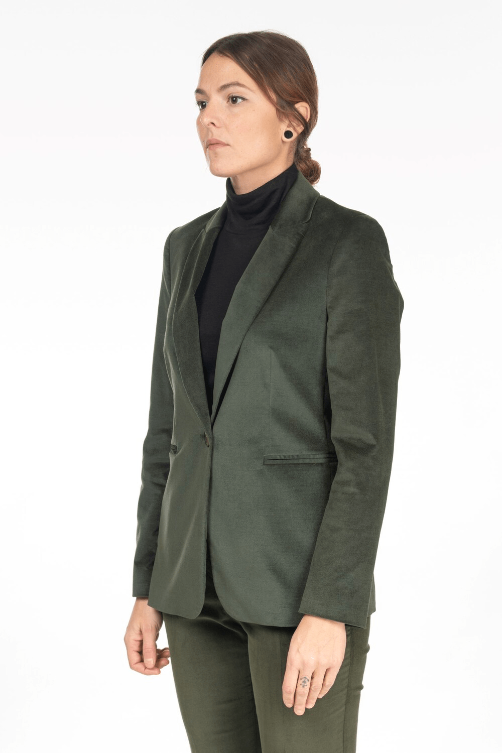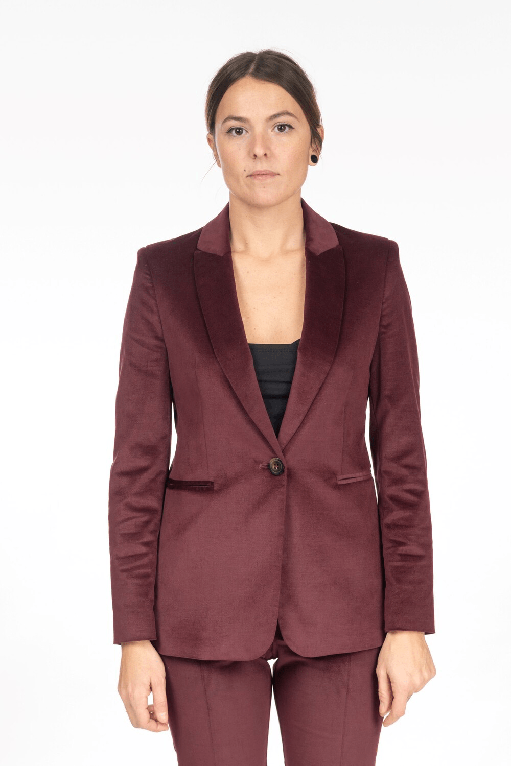 Giacca blazer in velluto liscio. La linea asciutta e leggermente lunga slancia la silhouette, mentre la morbidezza del tessuto stretch con una percentuale di modal, offre un comfort impareggiabile. Da abbinare ai pantaloni nello stesso tessuto per creare look più formali o da indossare con bluse e maglie, per un look casual - chic. Vestibilità asciutta. Rever monobottone, tasche a filetto. Manica lunga. Tessuto misto cotone modale stretch. Fodera stampata logata.