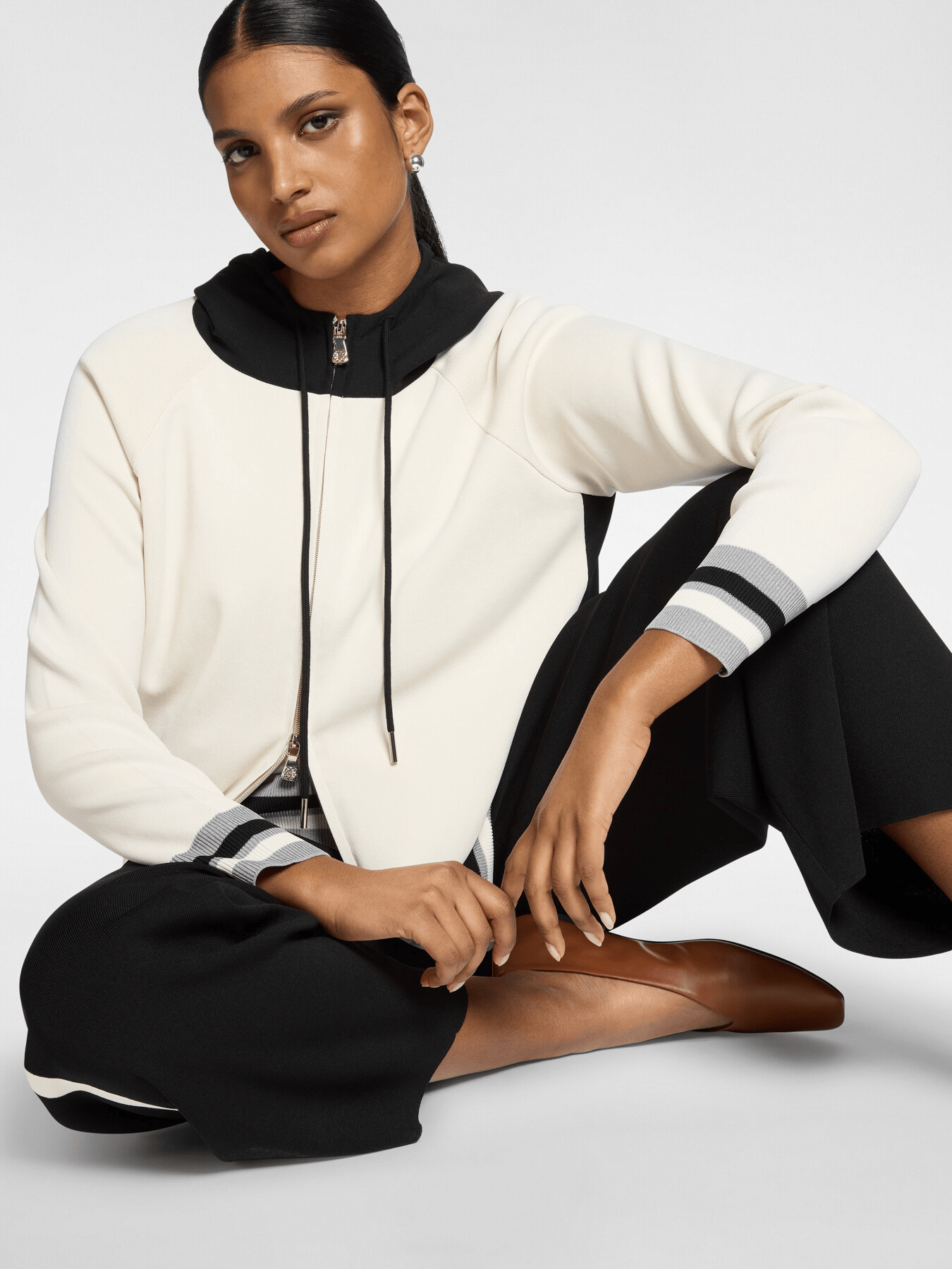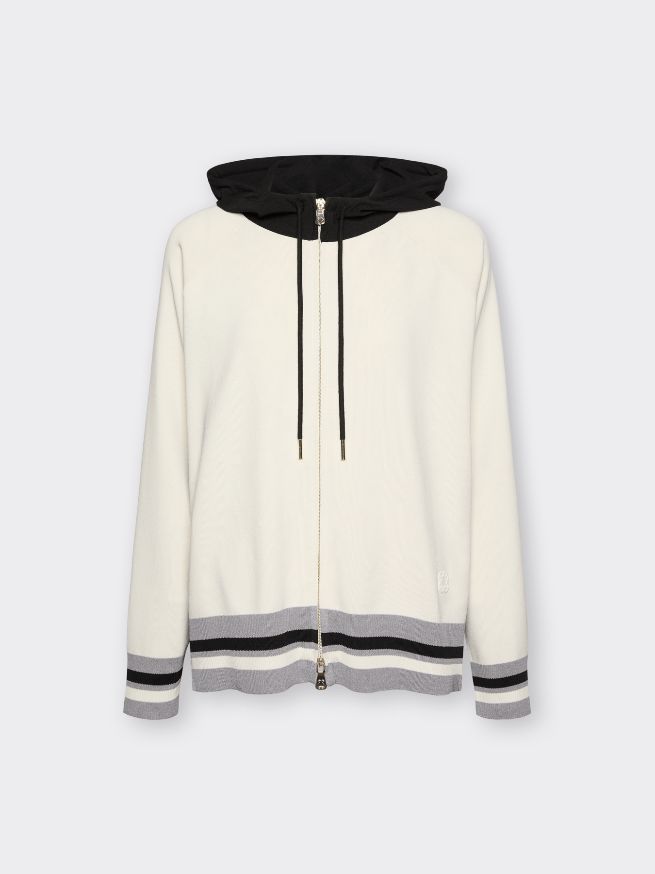Cardigan in misto viscosa con cappuccio e zip frontale, arricchito da dettagli rigati sui bordi e polsini. La linea comoda si adatta al tempo libero e alle occasioni informali. Versatile con jeans o pantalone coordinato, ideale per uno stile sporty chic.