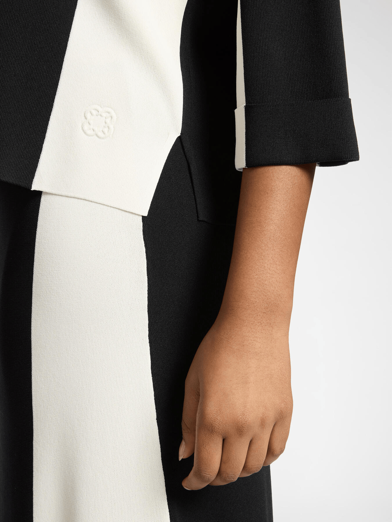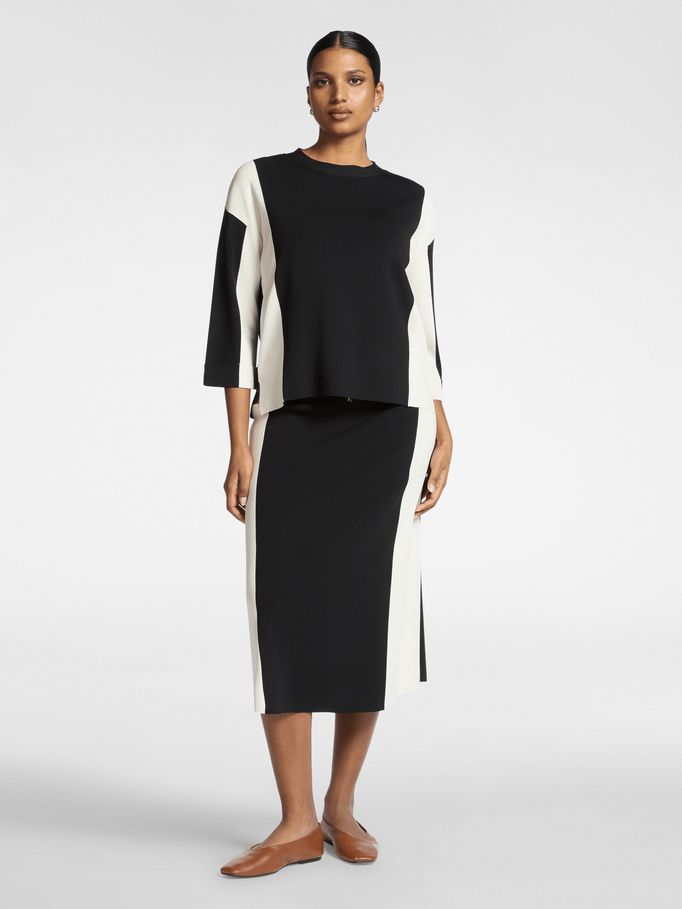Maglia in misto viscosa dal design bicolor con maniche a tre quarti e girocollo. La lavorazione nei due colori crea un effetto grafico moderno. Versatile con pantaloni sartoriali o jeans, per un look sporty chic.