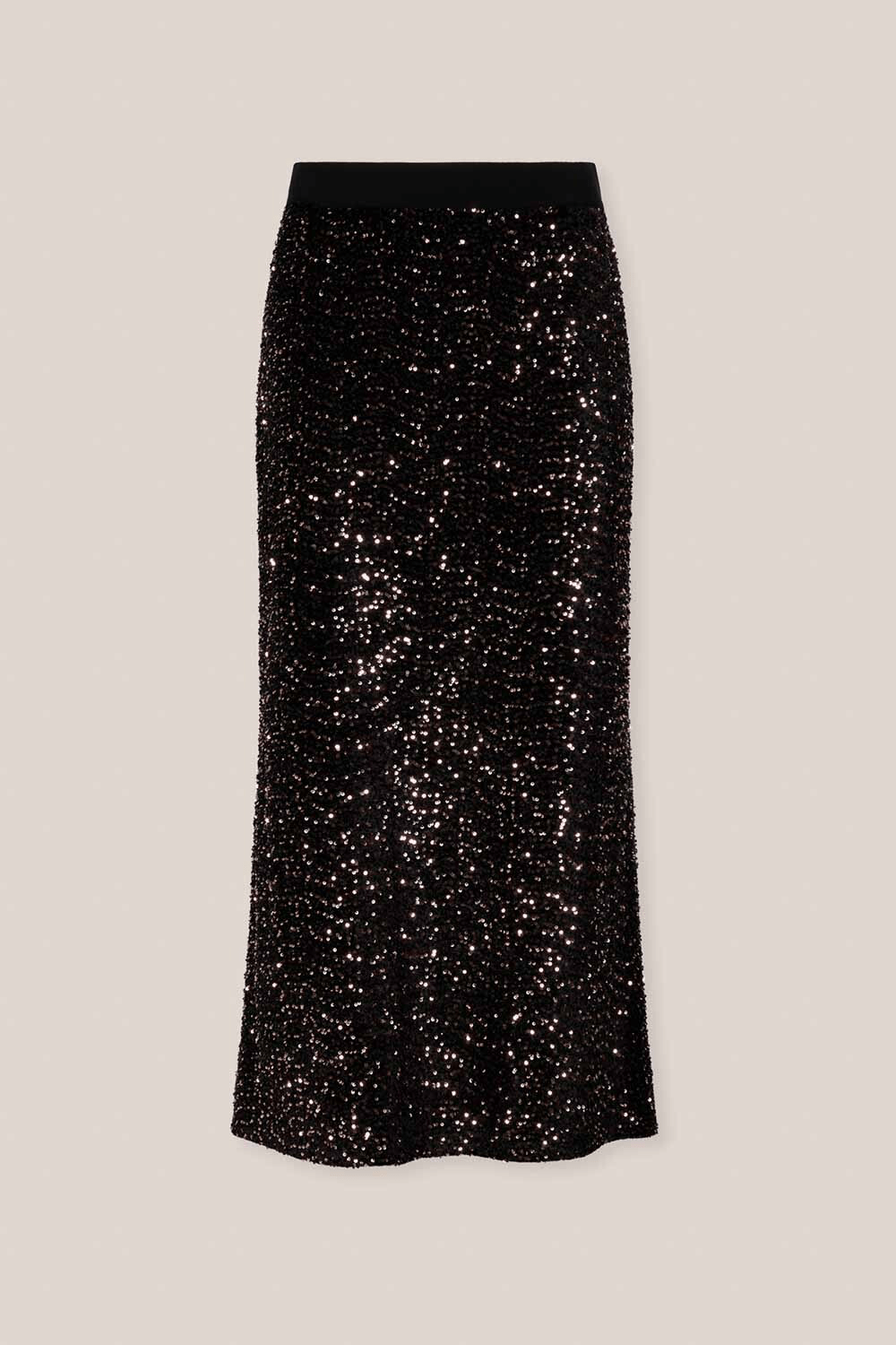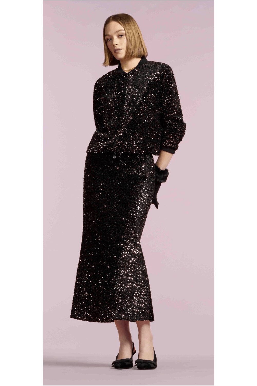 Gonna midi dall'allure sofisticata, in ciniglia con paillettes. Ben si adatta ad eventi unici e occasioni speciali. Da indossare sotto un maxicappotto.