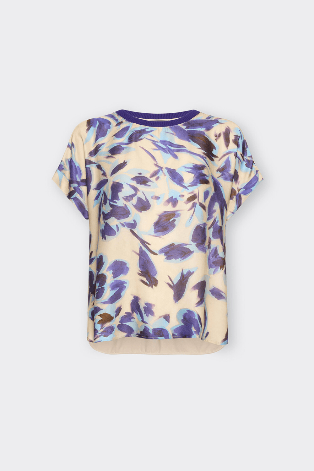 Kimonetta bimaterica in jersey e twill stampato in raso di viscosa. La t-shirt ha un girocollo a costina ed è super confortevole.