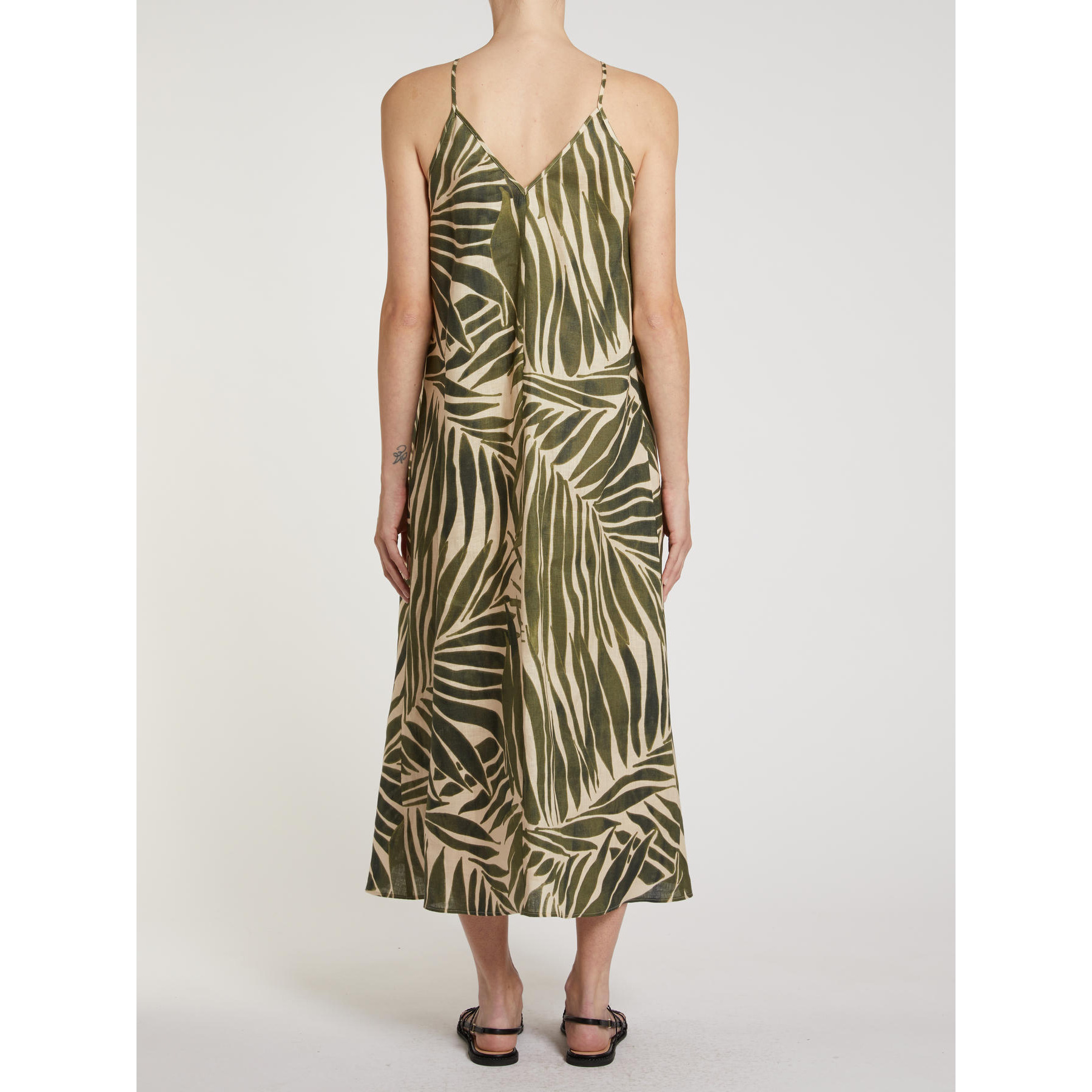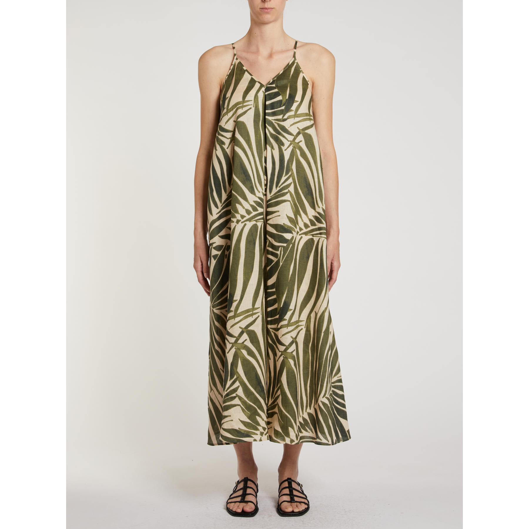 Foglie di palma creano una fantasia grafica su questo abito dal taglio arioso in puro lino, per unire freschezza e stile in un mix perfetto.
