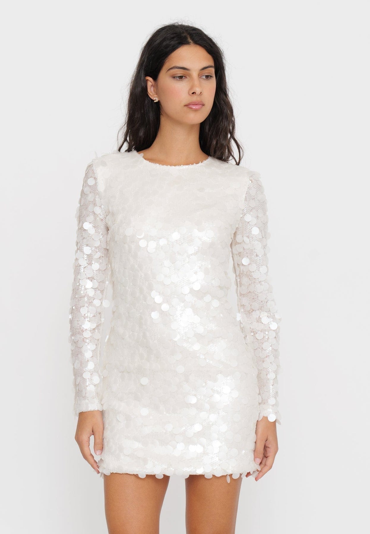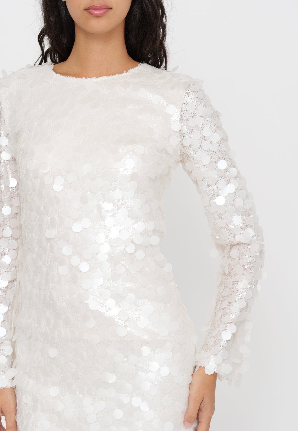 Abito mini con manica lunga in macro paillettes, perfetto per chi desidera brillare con stile in ogni occasione serale. Il design aderente valorizza la silhouette mentre le grandi paillettes catturano la luce creando un effetto scenico sofisticato.