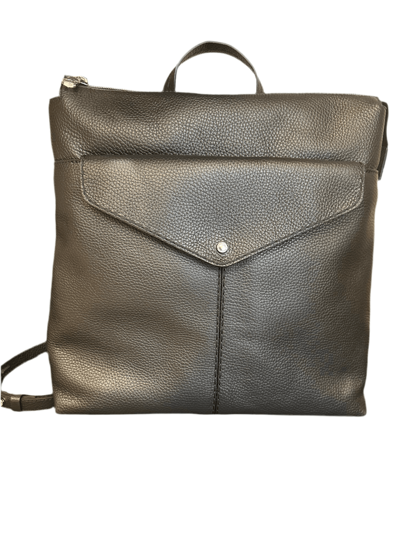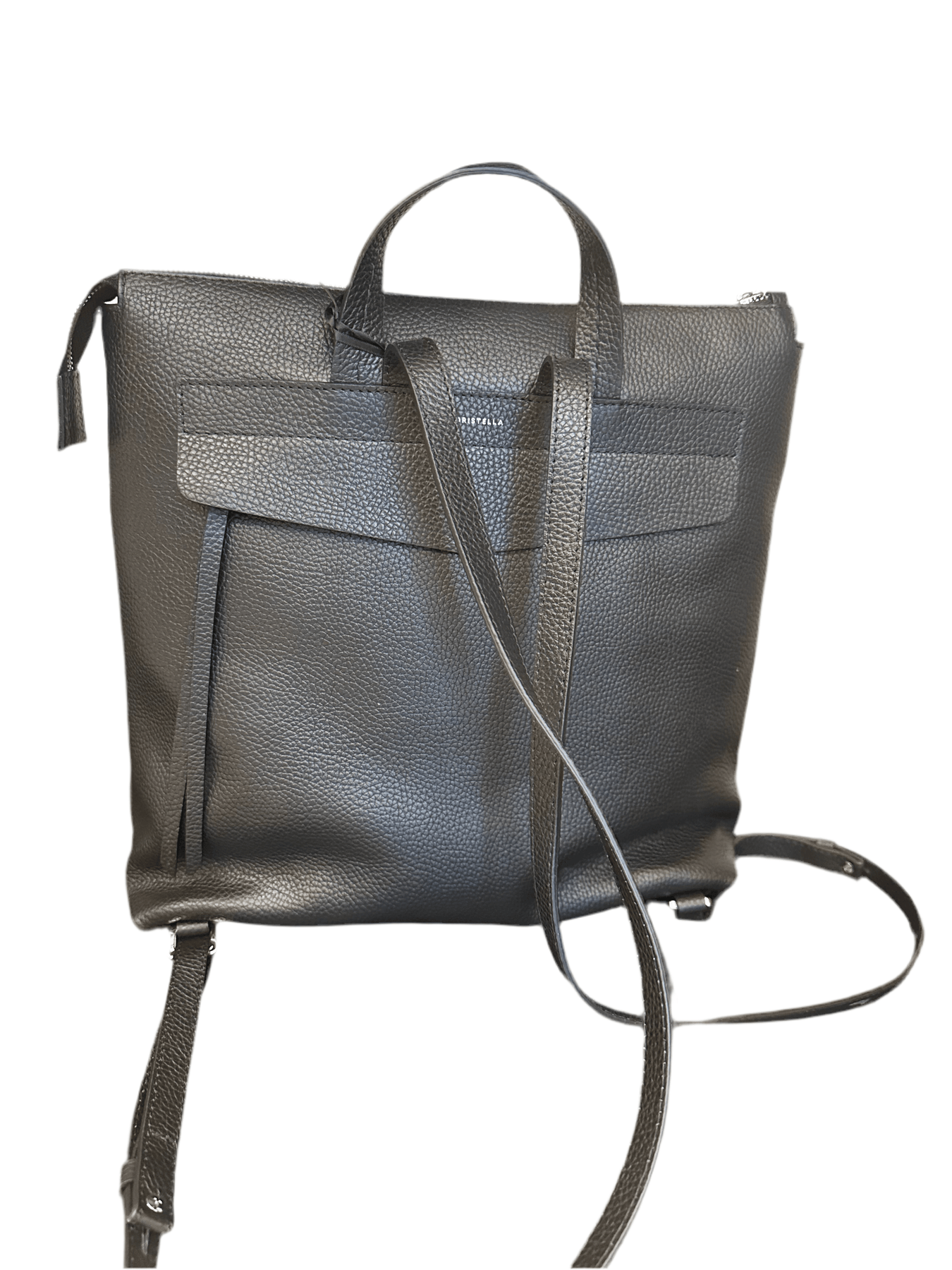 Zaino in pelle. Accessori metallici color nickel. Chiusura superiore con cerniera. Tasca interna con cerniera, tasca porta cellulare. Sul retro, una tasca sicura e capiente chiusa con zip.