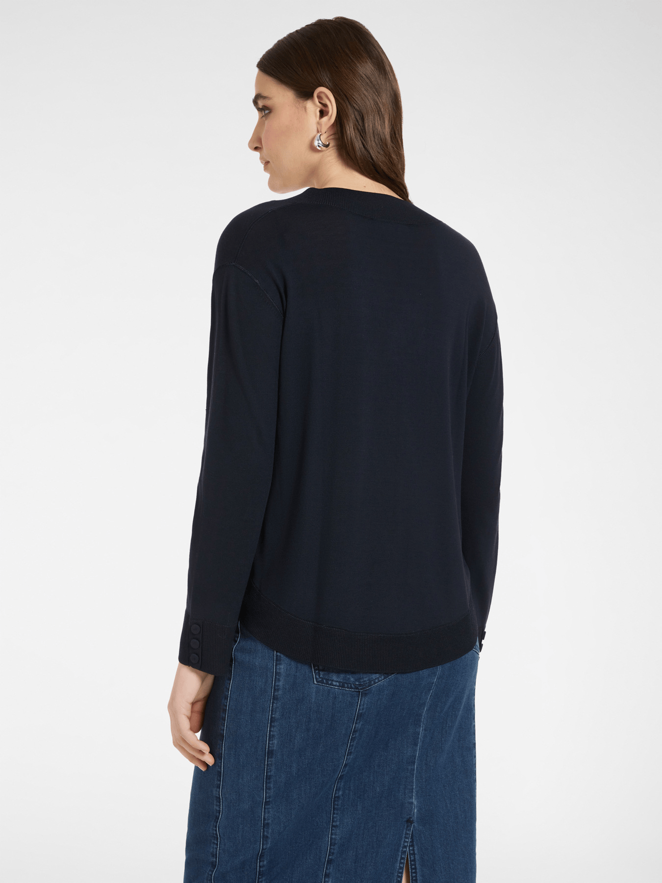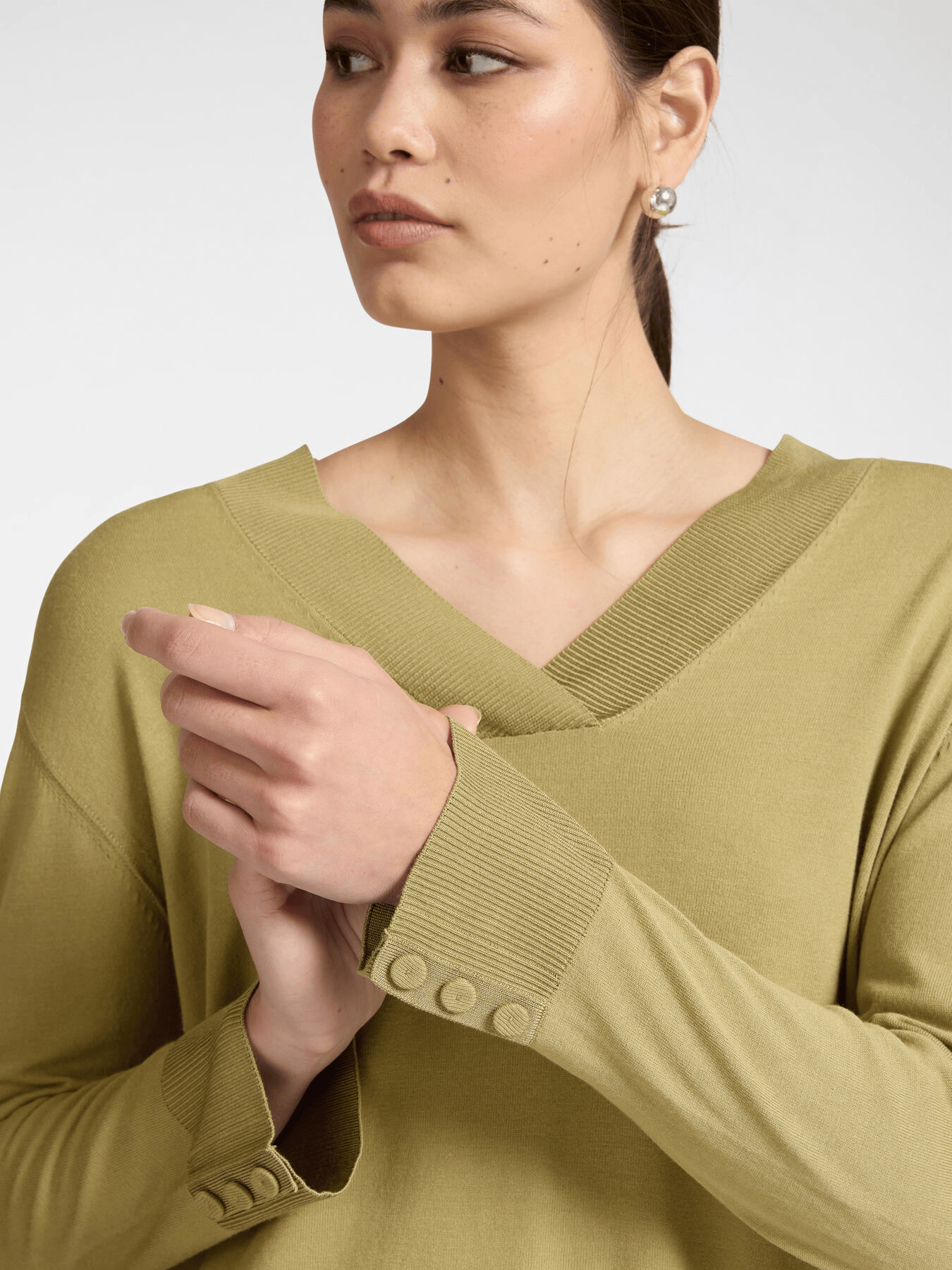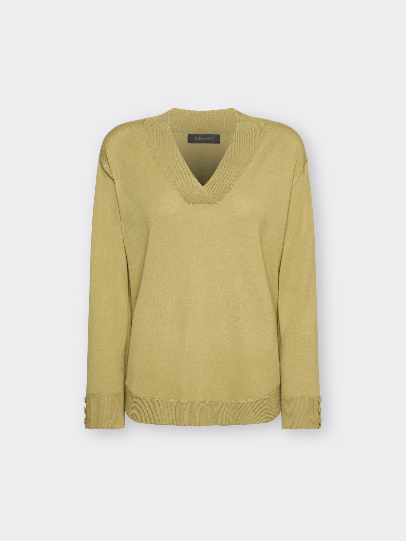 Maglia in misto viscosa con scollo a V e maniche lunghe. I bottoni decorativi sui polsini aggiungono un dettaglio raffinato. Versatile con pantaloni sartoriali o jeans per ogni occasione.
