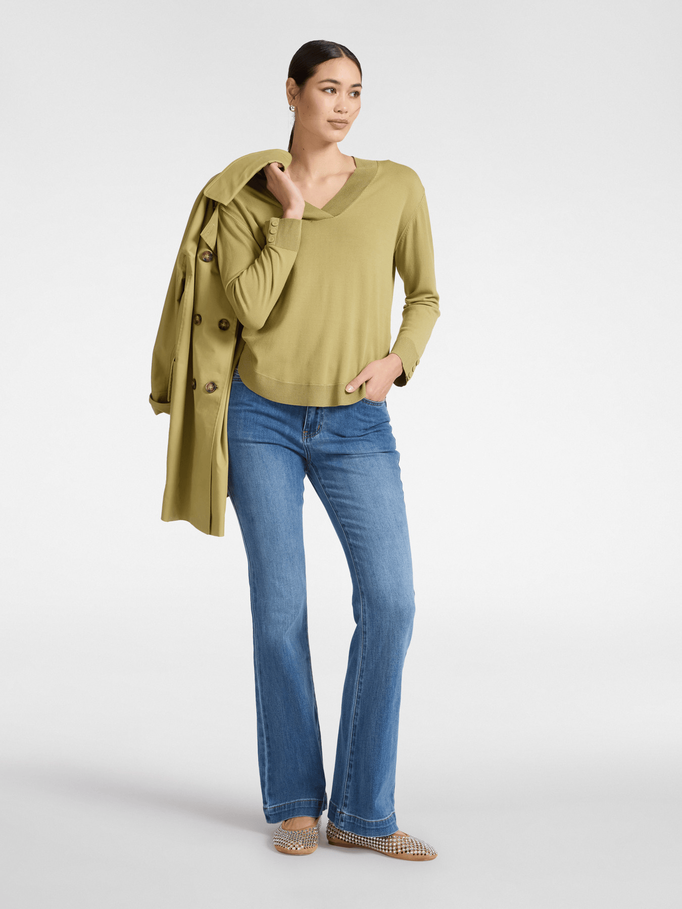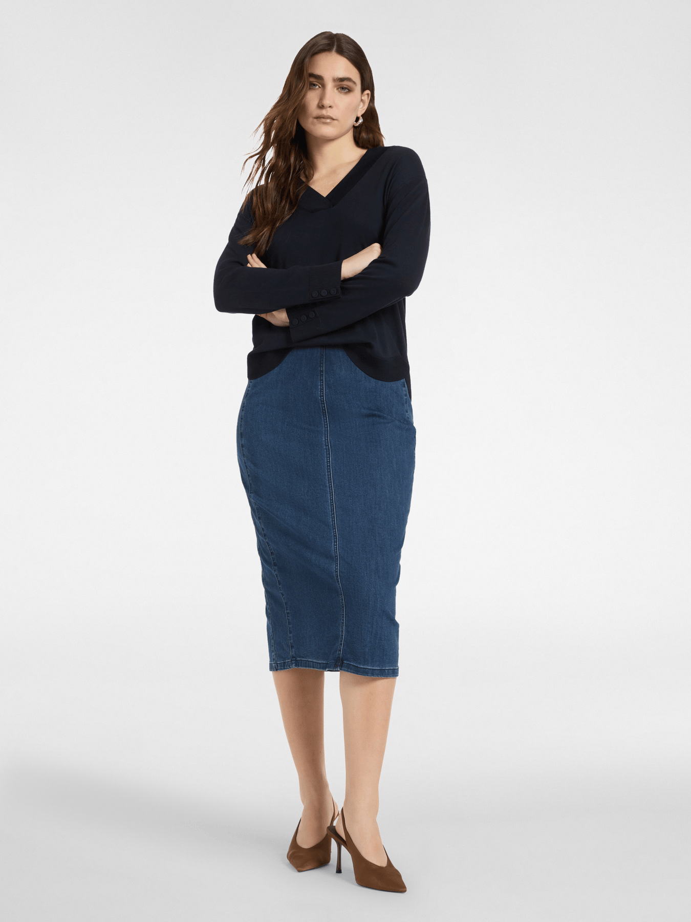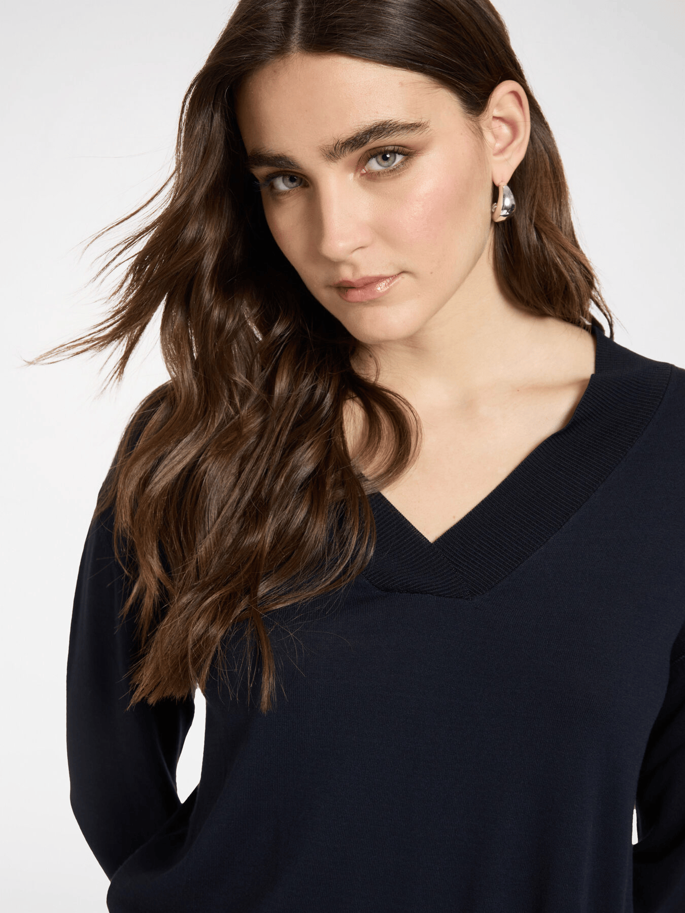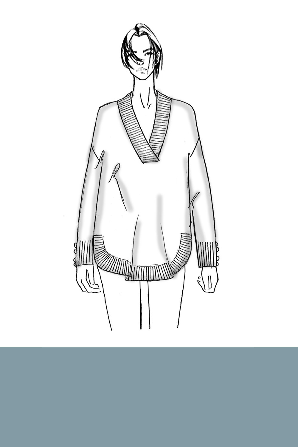 Maglia in misto viscosa con scollo a V e maniche lunghe. I bottoni decorativi sui polsini aggiungono un dettaglio raffinato. Versatile con pantaloni sartoriali o jeans per ogni occasione.