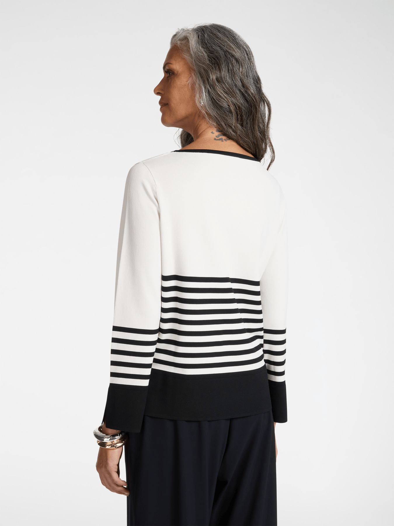 Maglia in misto viscosa con girocollo, bordi neri e righe al fondo. Si abbina con jeans o pantaloni sartoriali per ogni occasione.