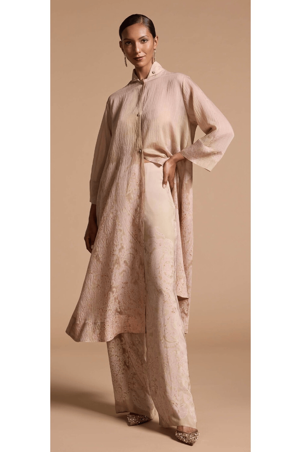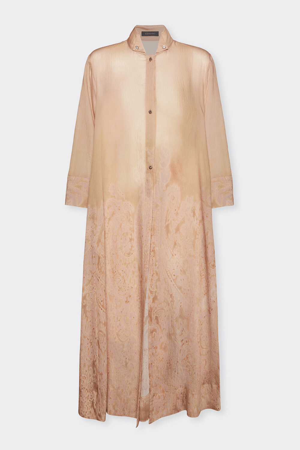 Prezioso soprabito in organzino con stampa piazzata e bottoncini gioiello. La Linea svasata e l'elegante manica tre quarti lo rende perfetto sia sopra il suo abito coordinato che sopra il pantalone. Ha il colletto con speciale motivo botton down e tasche inserite nei fianchi.