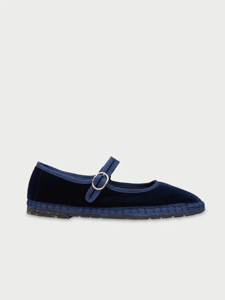 • Mary Jane in velluto blu scuro con profili blu scuro e chiusura con fibbia.