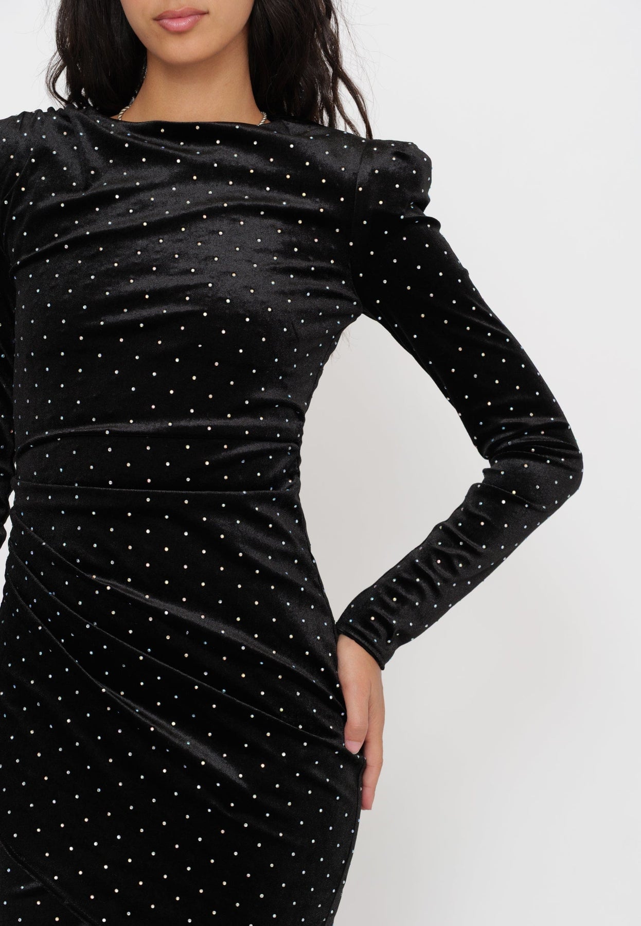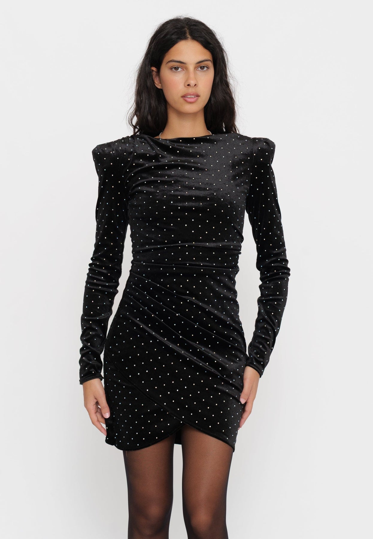 Questo abito mini in velluto combina eleganza e stile contemporaneo, grazie alle spalle ampie che donano struttura e un tocco di sofisticatezza. I brillantini aggiungono un dettaglio luminoso, ideale per occasioni speciali o serate eleganti. La vestibilità accattivante valorizza la silhouette mantenendo comfort e charme.