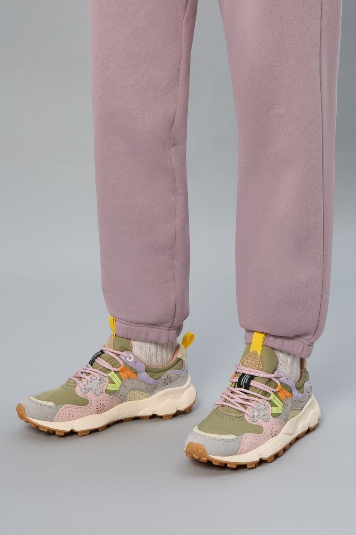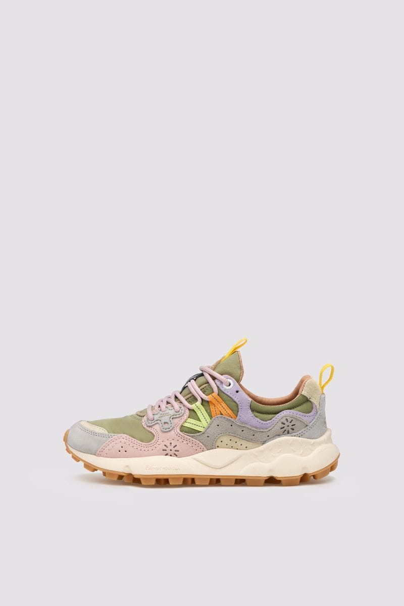 Sneaker in tessuto tecnico con inserti in suede multicolor. Occhielli rinforzati e lacci trek. Soletta interna in sughero naturale antibatterico, fondo in gomma ultra leggera con battistrada dentellato.