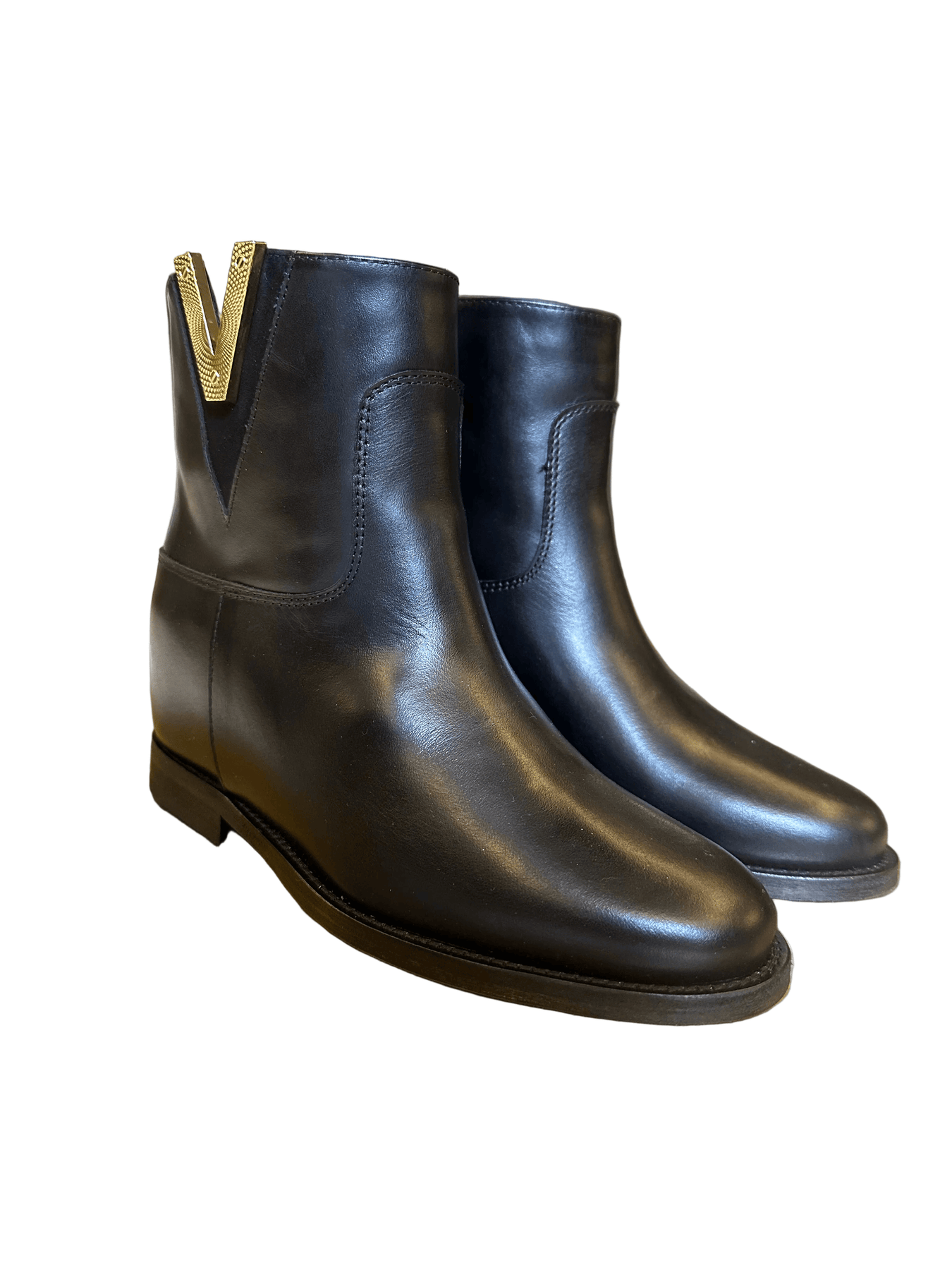 Tronchetto con tomaia in pelle. Dettaglio “V Diamantata” sul lato esterno con inserto scamosciato. Fodera interna in pelle. Tacco 2 cm con antiscivolo. Plantare con alzatacco interno 5 cm estraibile.