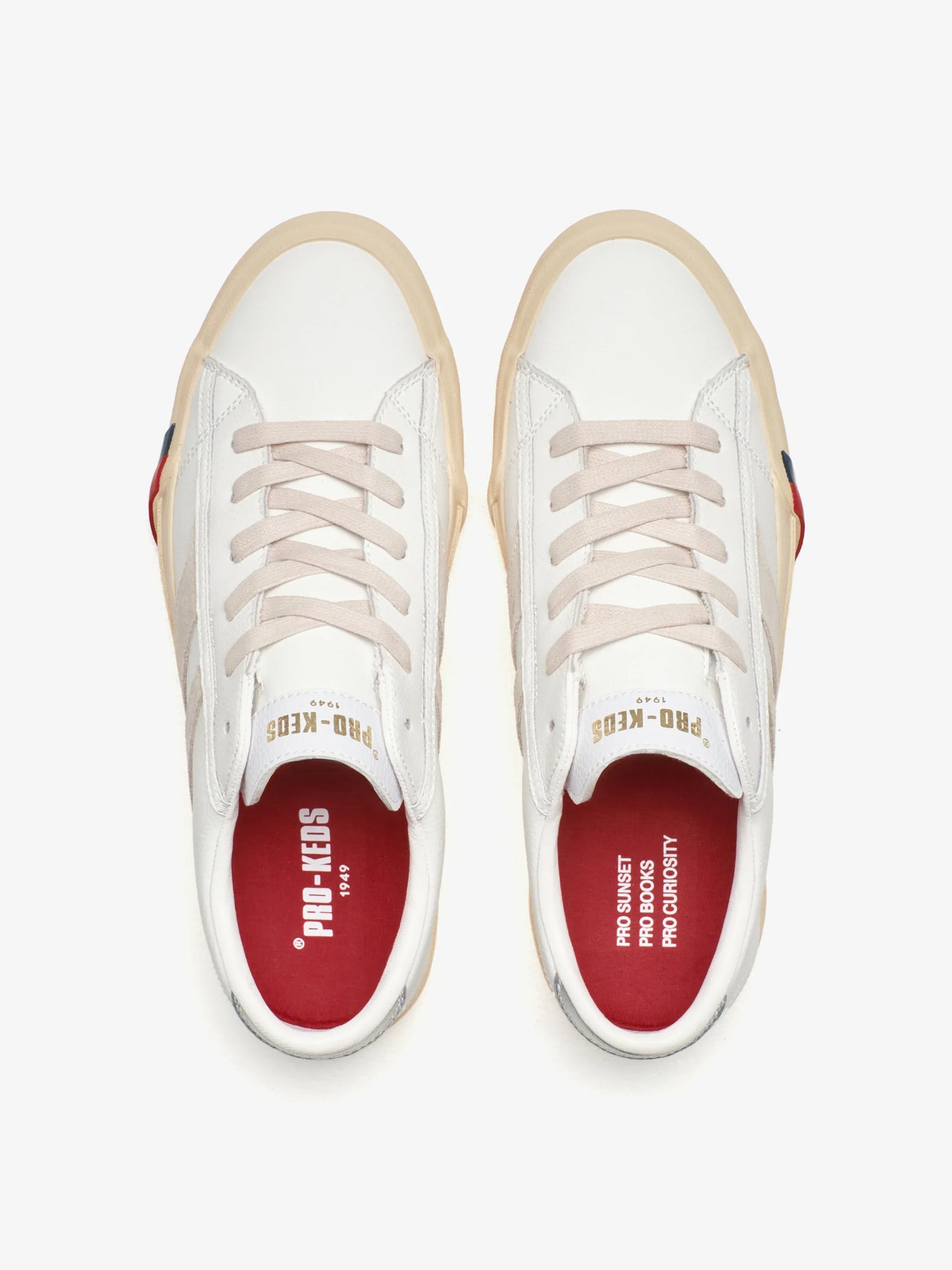Sneaker presenta la tomaia in pelle con inserti in suede e suola in gomma, con l'iconica logatura rosso-blu che prosegue sotto il battistrada. RC226SLM LS WH00008.
