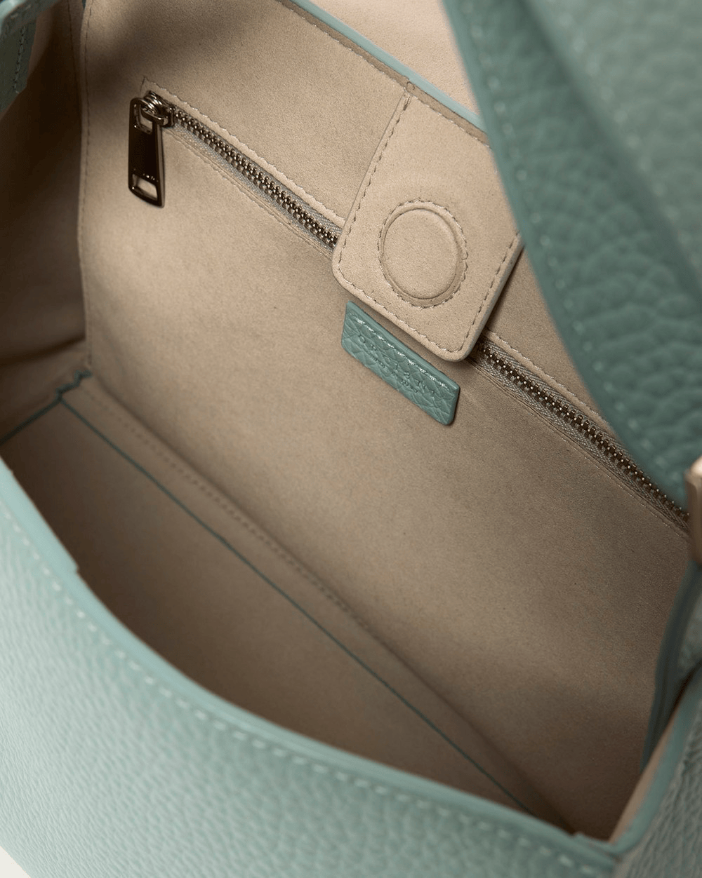 La morbida pelle martellata e l'apertura a scomparsa consentono di accedere comodamente all'interno della borsa senza sollevare la patta. La tasca interna con zip è personalizzabile in oro o argento con un massimo di 3 iniziali, per renderla un accessorio unico e prezioso.