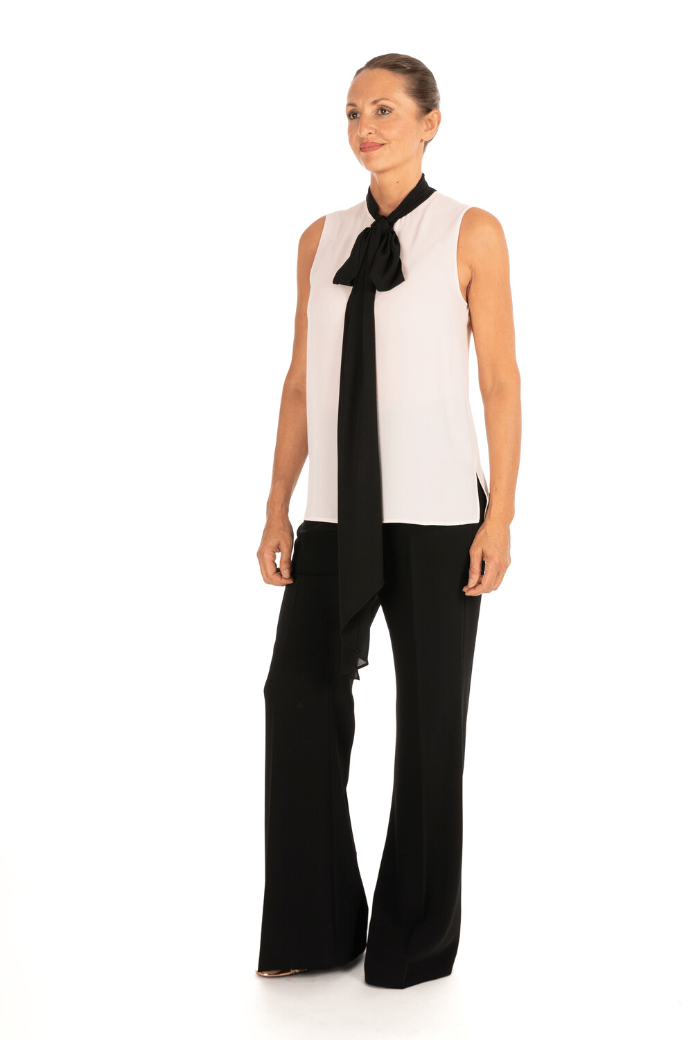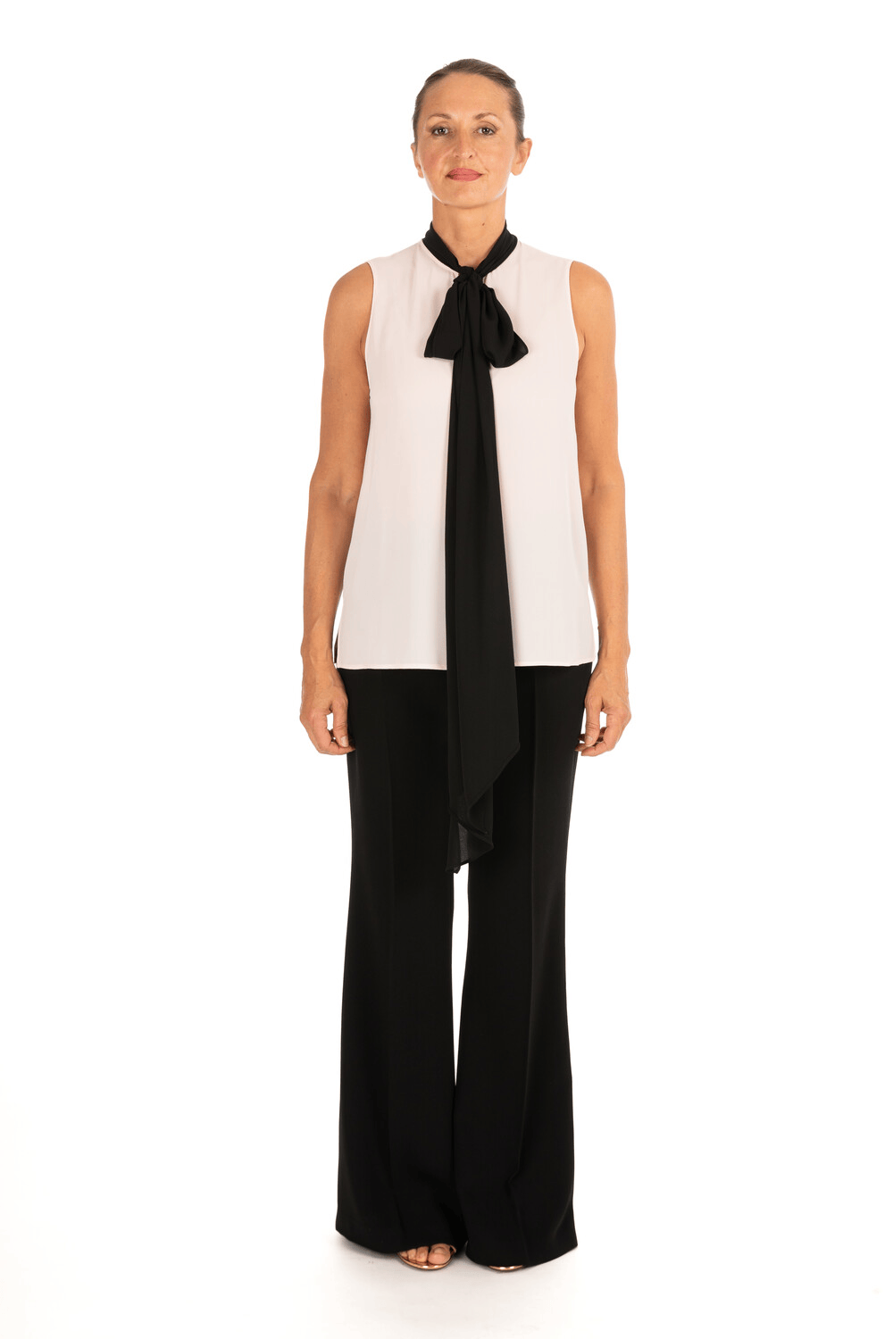 Blusa smanicata con collo alto e maxi fiocco nero in contrasto che scende lungo il davanti, creando un raffinato effetto cravatta. Il taglio dritto e la linea pulita valorizzano la figura con sobria eleganza.
