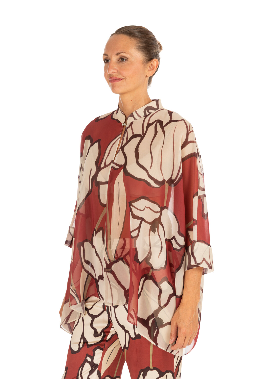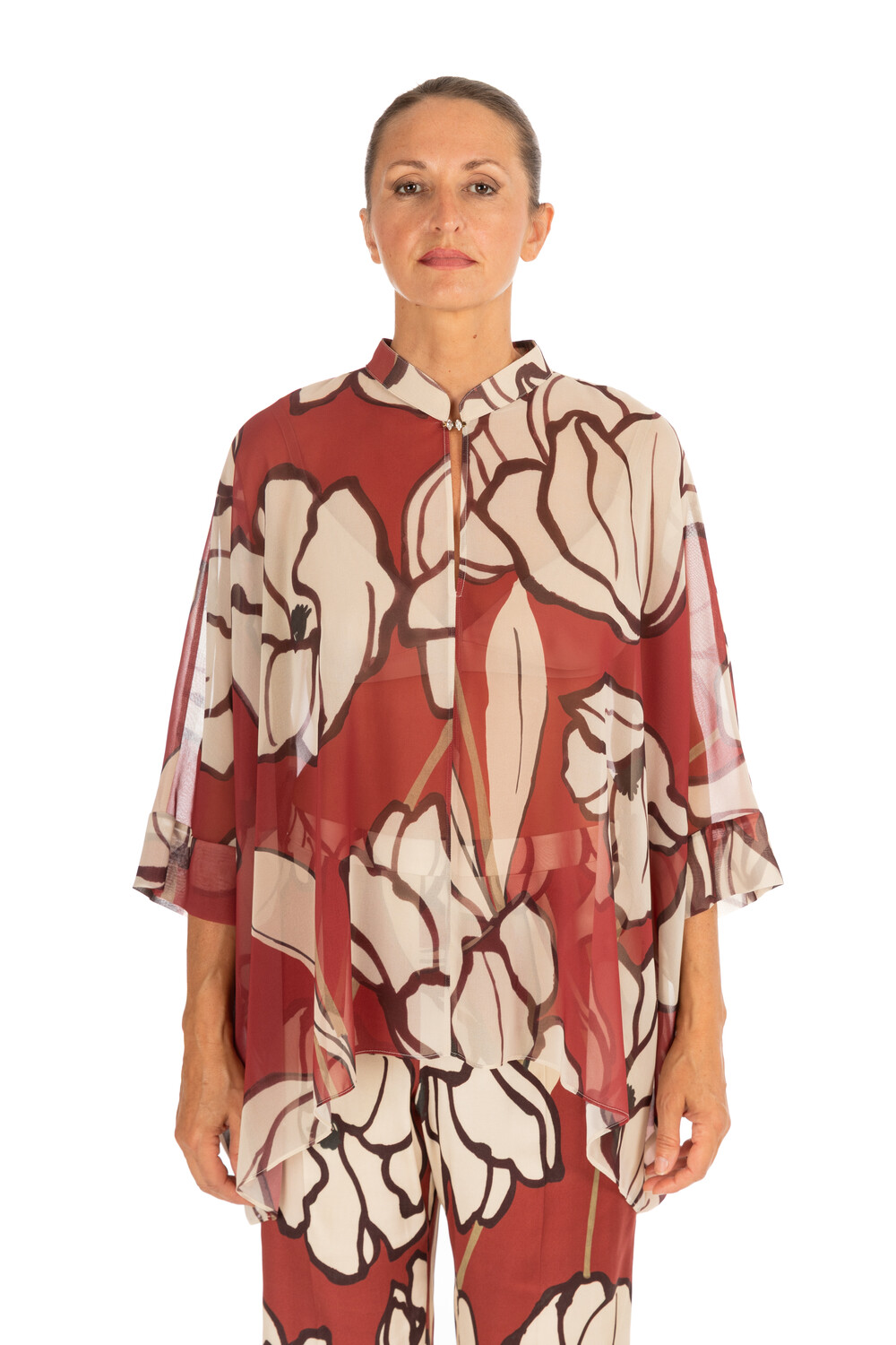 Camicia/caftano in georgette stampata con manica sciallata, arricchito da dettaglio un gancetto gioiello. Adatto per i look più raffinati.