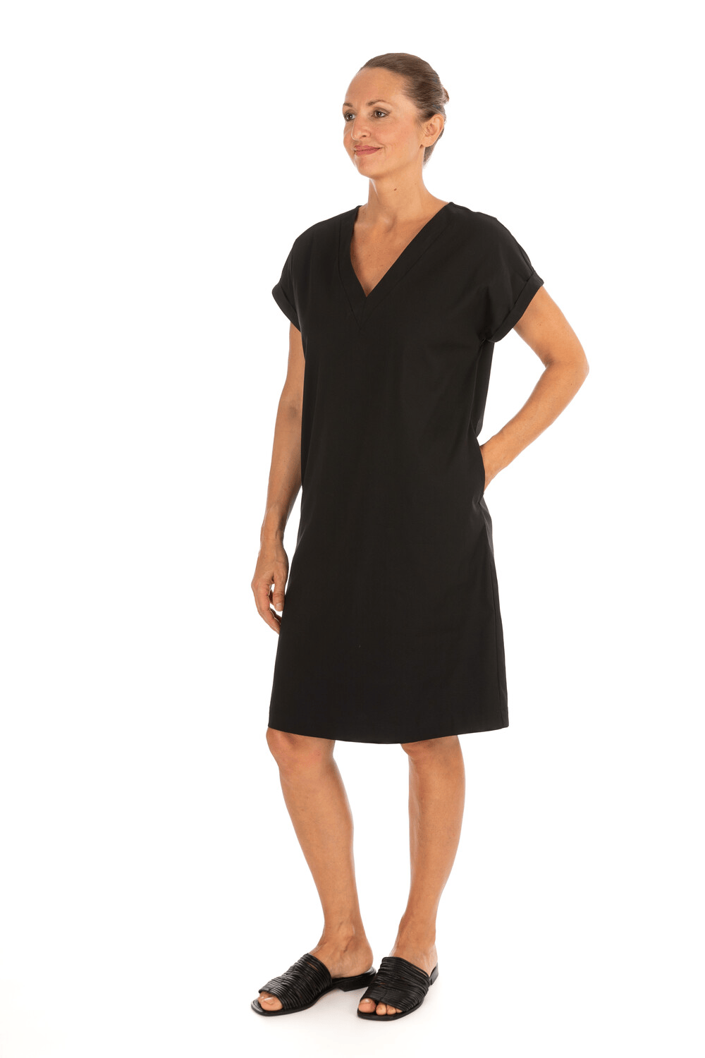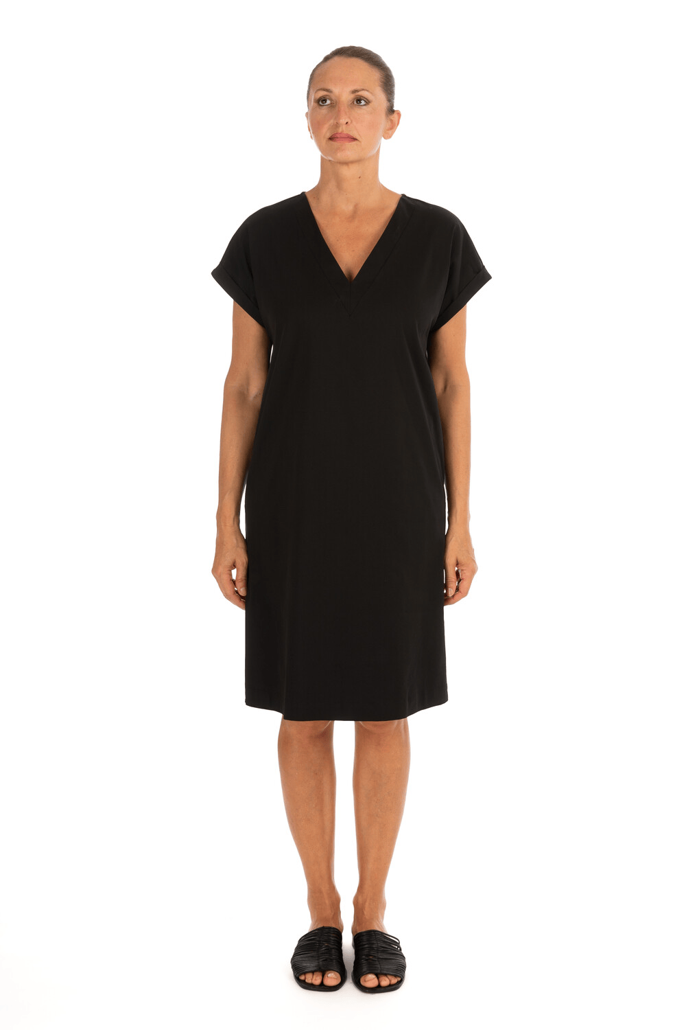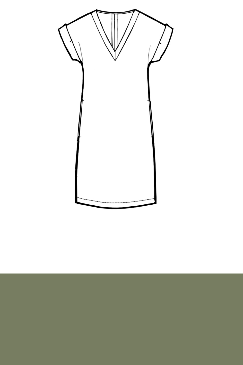Abito corto caratterizzato da una scollatura a V ribattuta ae maniche corte con risvolto. La linea morbida e dritta regala comfort e libertà di movimento.