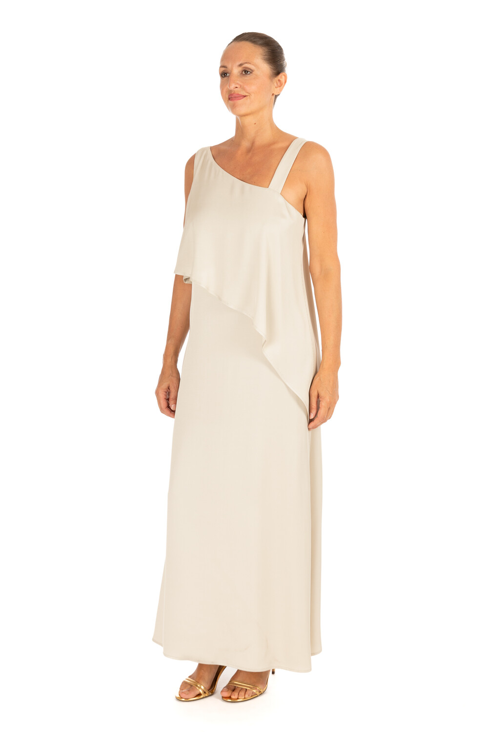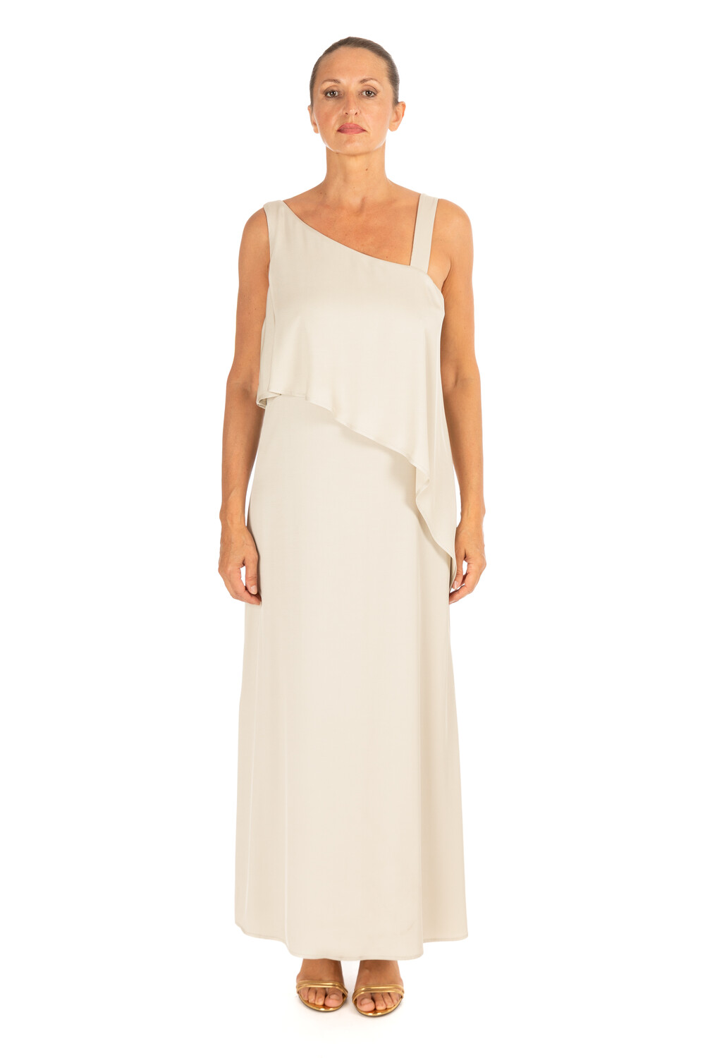 Abito lungo monospalla con pannello asimmetrico sovrapposto e linea morbida che accompagna la silhouette con eleganza. Il taglio pulito e l'effetto drappeggiato donano movimento e raffinatezza.