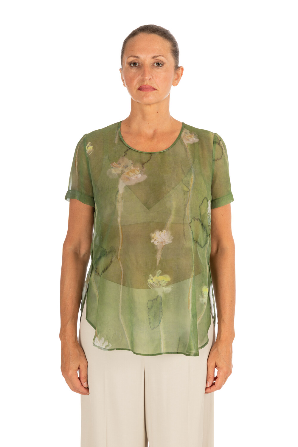 Blusa in georgette leggera con stampa. Il design essenziale con scollo tondo e maniche corte valorizza la trasparenza del tessuto con delicata eleganza. Perfetta per look estivi raffinati, si abbina facilmente a pantaloni chiari o gonne fluidi, aggiungendo un tocco poetico e naturale all'outfit.
