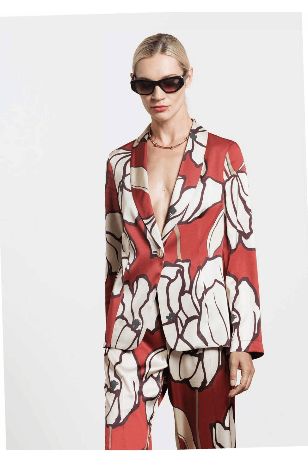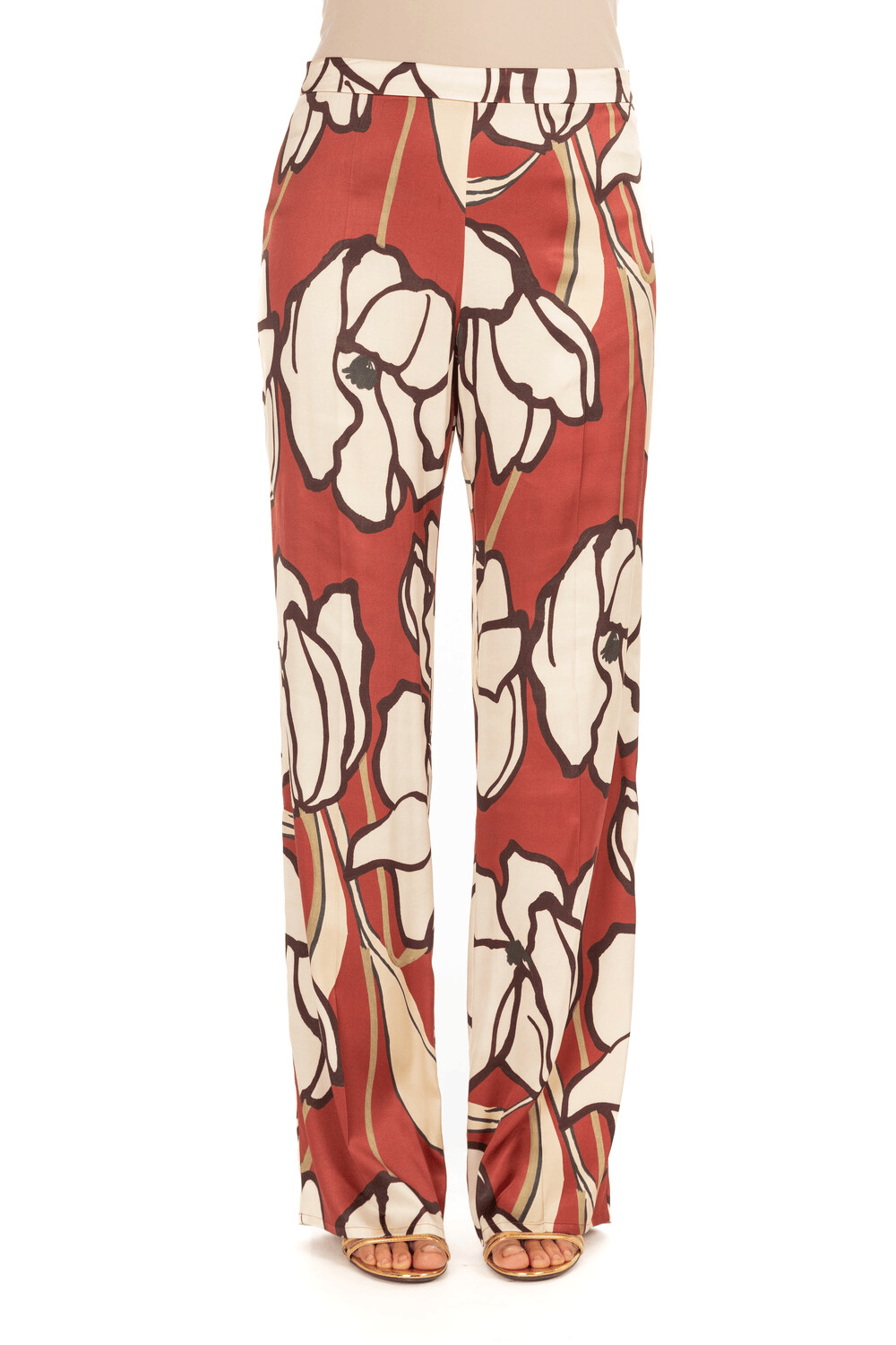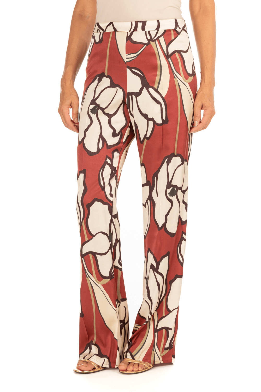 Pantaloni ampi in raso stampato, dal taglio dritto e fluido che valorizza la figura con eleganza. Vita regolare e chiusura frontale nascosta per un effetto pulito e raffinato.