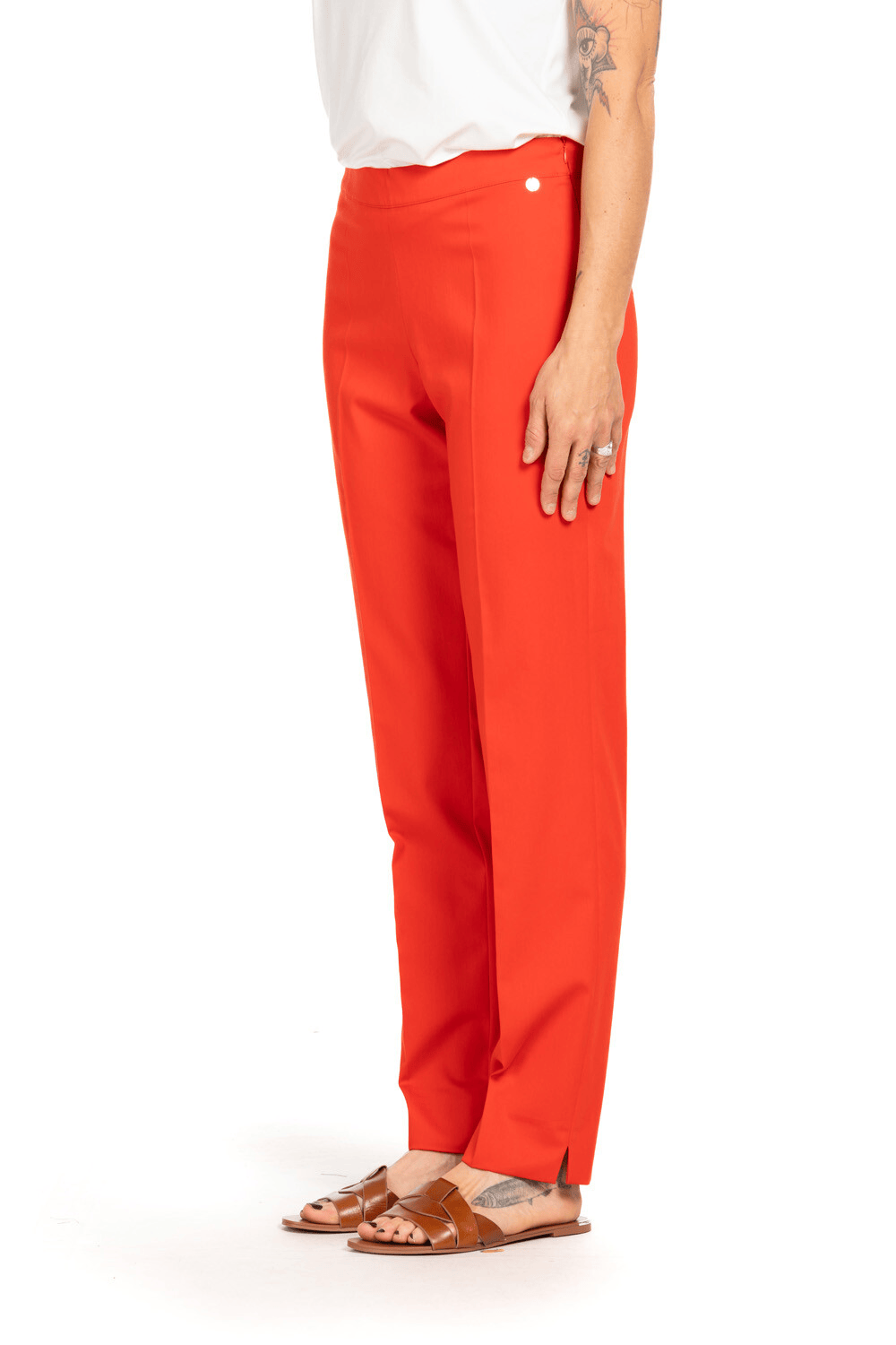 Pantalone in tessuto raso di cotone stretch dal taglio slim, proposto in un acceso rosso papavero. La silhouette asciutta e la vita regolare valorizzano la figura, mentre la piega stirata dona un tocco sartoriale.