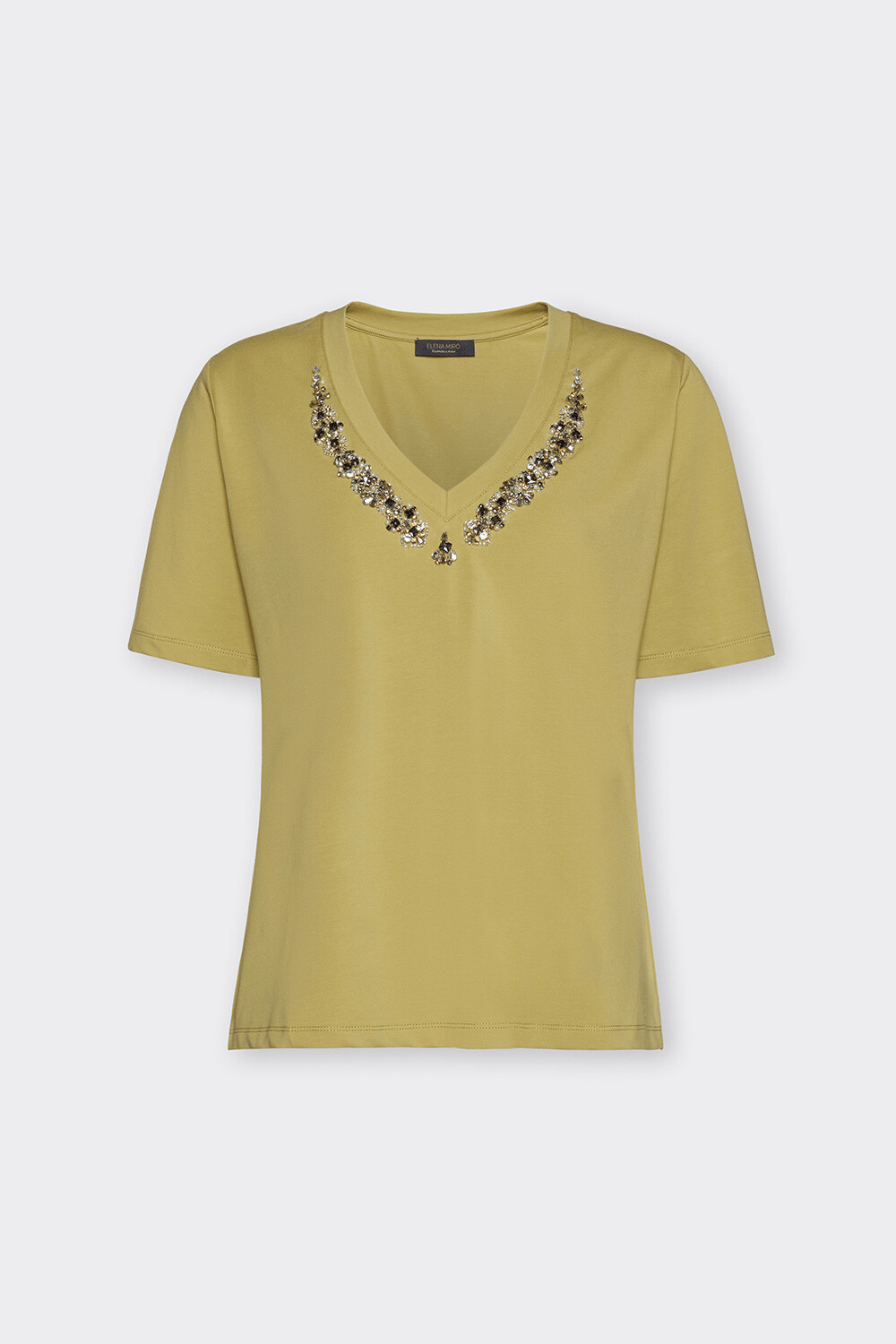 T-shirt manica corta in jersey di cotone stretch manica corta, linea regular. Sul davanti della t-shirt c'è la versione in perline sfaccettate colorate ma trasparenti del monogramma.. T-shirt personalizzata è preziosa per il ricamo e perfetta da utilizzare in abbinamento sia ad un cardigan che un giubbotto od ad una blazer.