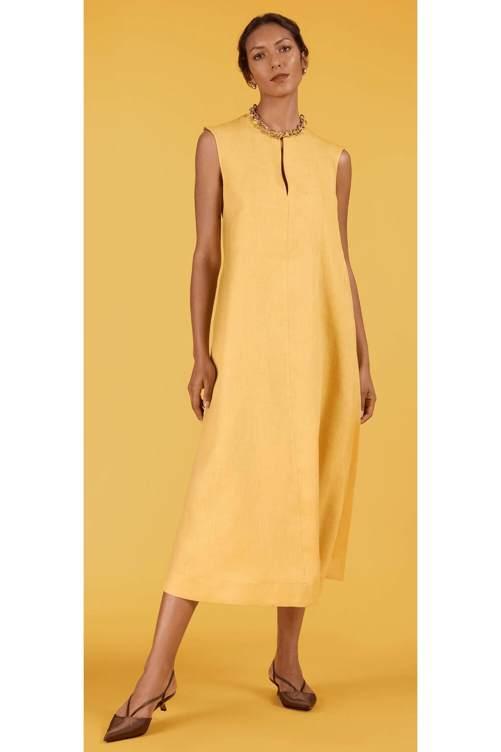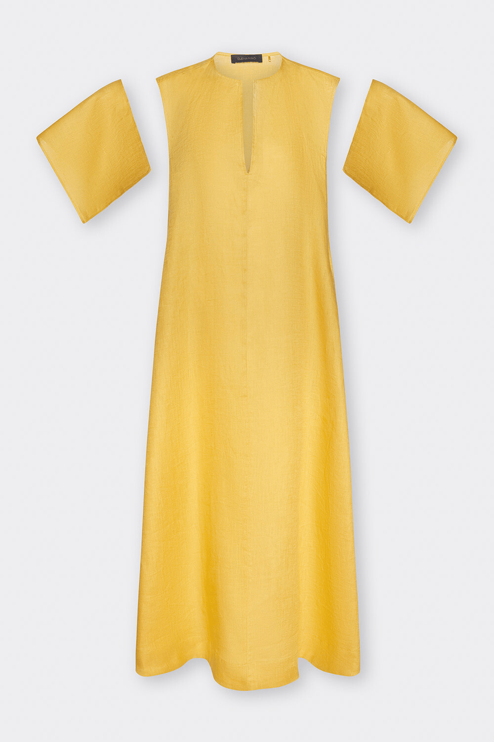 Dal design pulito e dalla vestibilità rilassata, questo abito lungo svasato in 100% lino presenta delle maniche attaccabili.. Il taglio centrale valorizza la figura e la linea svasata dona ampiezza e movimento.