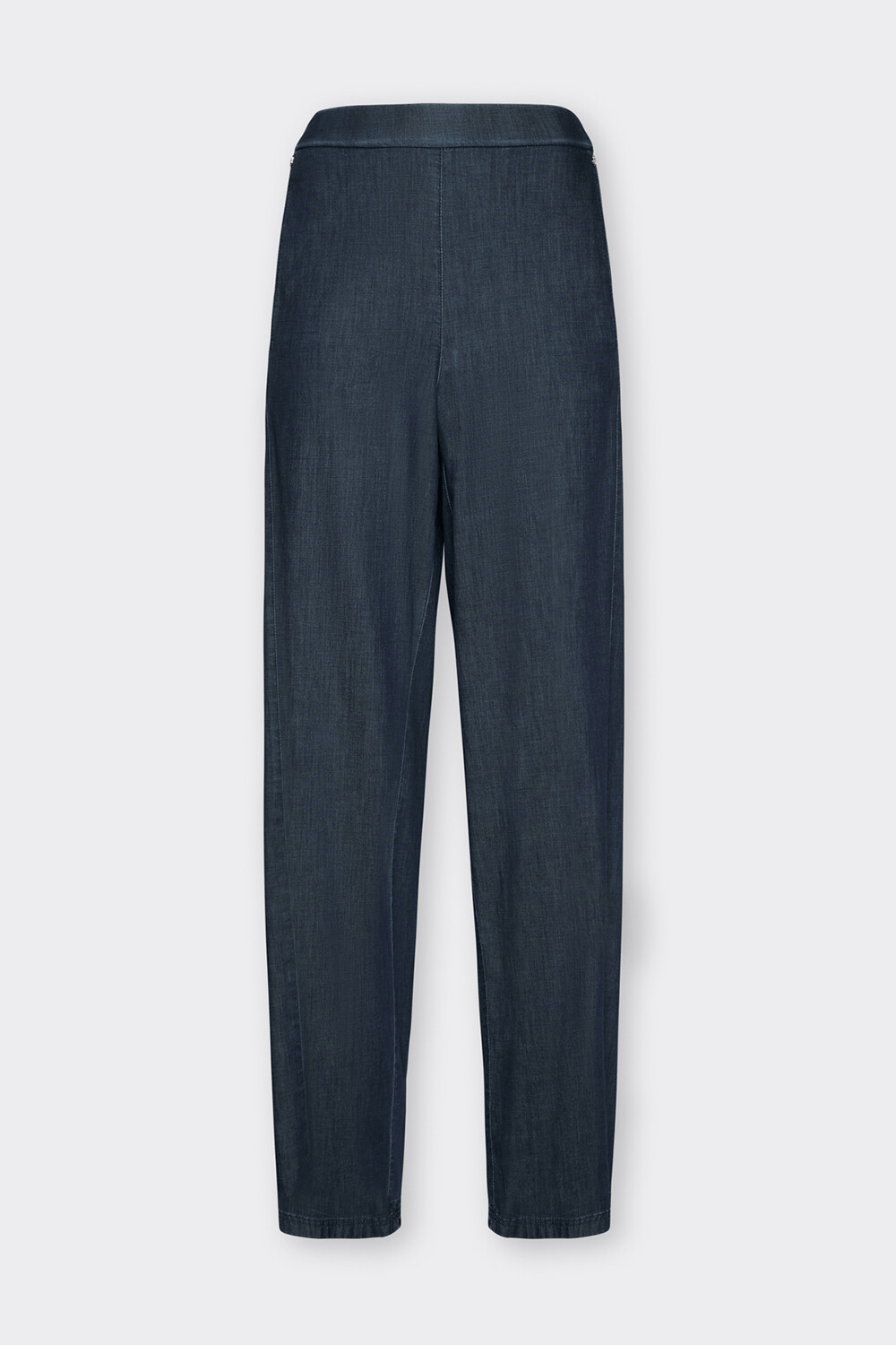 Jeans pull on carot, realizzato in chambrè, dalla consistenza leggera e dal touch morbido dato dal semplice lavaggio blu scuro. Il modello moderno dalla gamba morbida stringe leggermente sul fondo. I tagli laterali sul davanti e le tasche inserite snelliscono e slanciano la silhouette. La vita si presenta liscia sul davanti ed elasticizzata sul dietro.