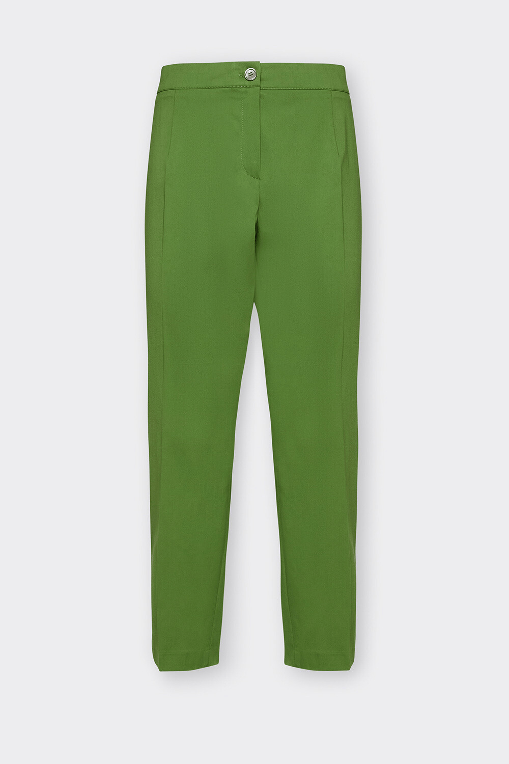 Pantalone capri in rasatello di cotone stretch, linea sigaretta, cintura estensibile, chiusura con zip e bottone, spacchetti combacianti al fondo orlo, piega stirata.