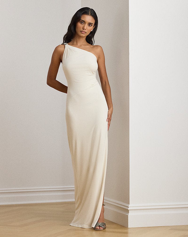 Taglio aderente. Lunghezza fino ai piedi. Silhouette monospalla. Cerniera posteriore centrale nascosta con chiusura a gancetto. Le pieghe si raccolgono sul lato sinistro. Delicate arricciature sullo scollo. Spacco sulla cucitura laterale sinistra.