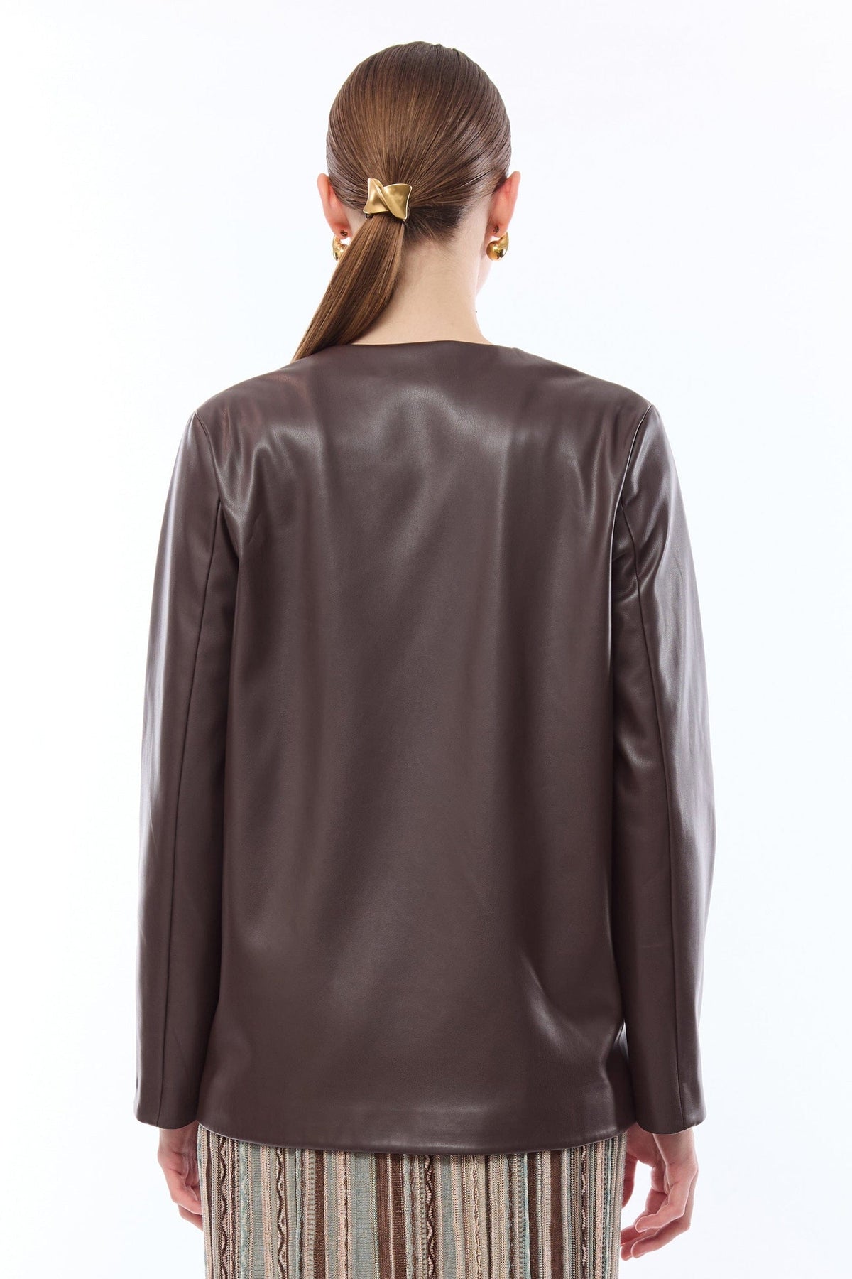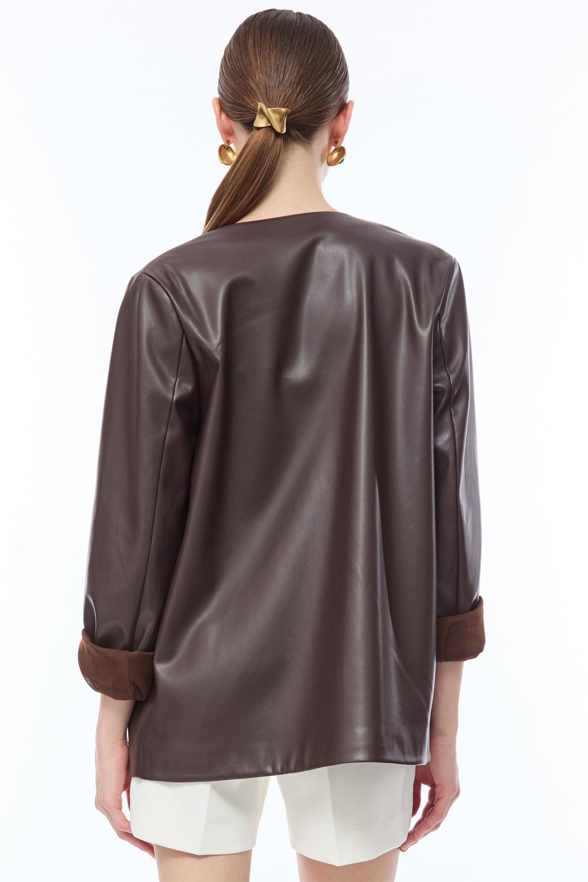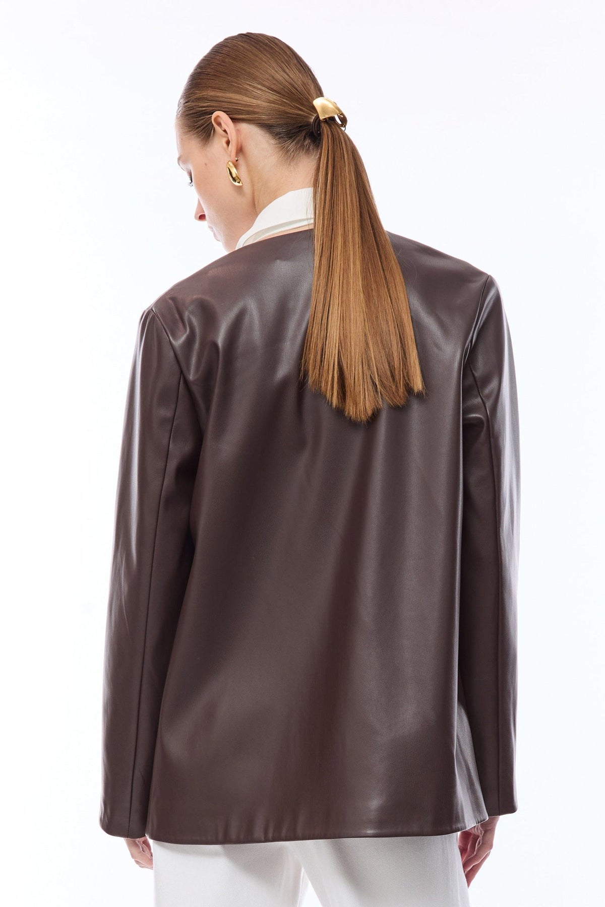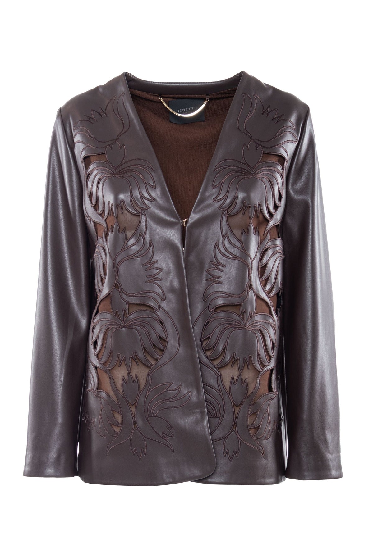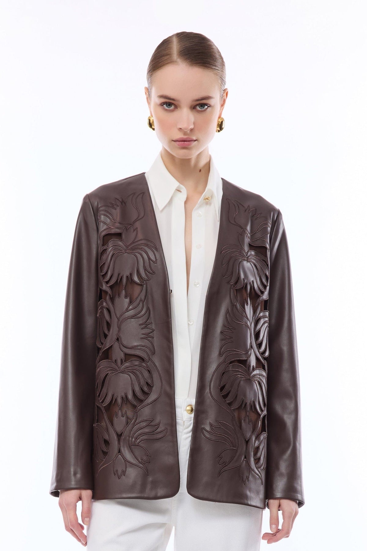 Giacca in ecopelle dal taglio dritto e lineare, caratterizzata da un'elegante apertura frontale senza bottoni. Il design è reso unico da raffinati intagli laser a motivo floreale sul davanti, che creano un sofisticato gioco di trasparenze. Rifinita con scollo a V e maniche lunghe, rappresenta un capospalla versatile ideale per elevare outfit formali o casual.