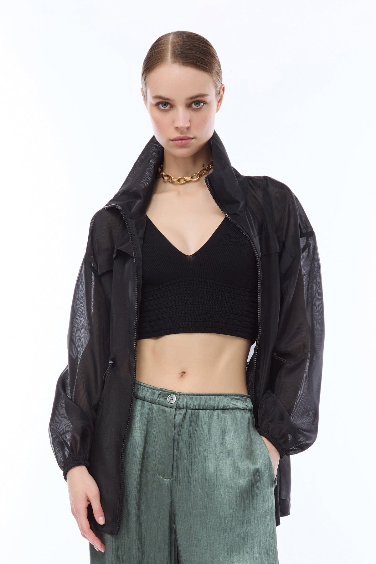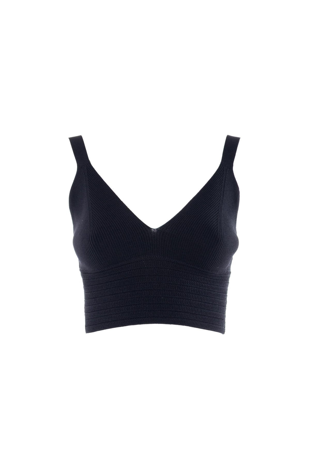 Top smanicato in maglia leggera contraddistinto da un profondo scollo a V e spalline larghe. Il design moderno è caratterizzato da una raffinata alternanza di fasce orizzontali velate e compatte che creano un gioco sofisticato. Rifiniture lineari sui bordi e una vestibilità fluida lo rendono perfetto per look contemporanei e stratificati.